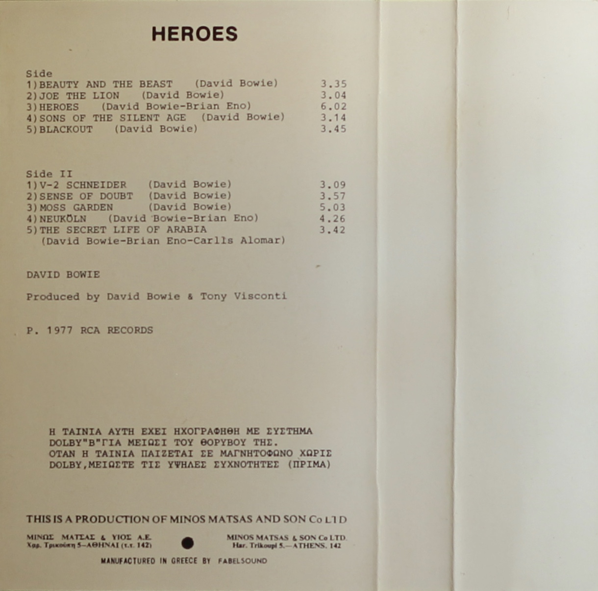 “Heroes”: Greece; RCA Victor; TC- RCLP 20131; no date.