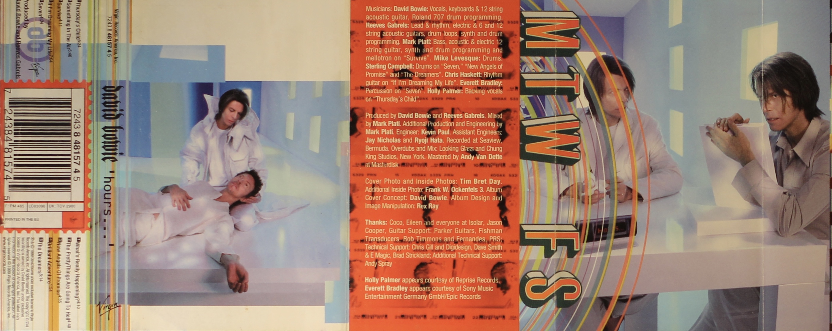 Concertina style cover on thick, glossy, folded paper with full frame photo on front, spine and rear panel. Album artwork incorporating track and personnel information printed over the remaining six inner and eight rear panels. ‘Hours’ sticker on case, in small text under ‘hours… is HOURS 1.