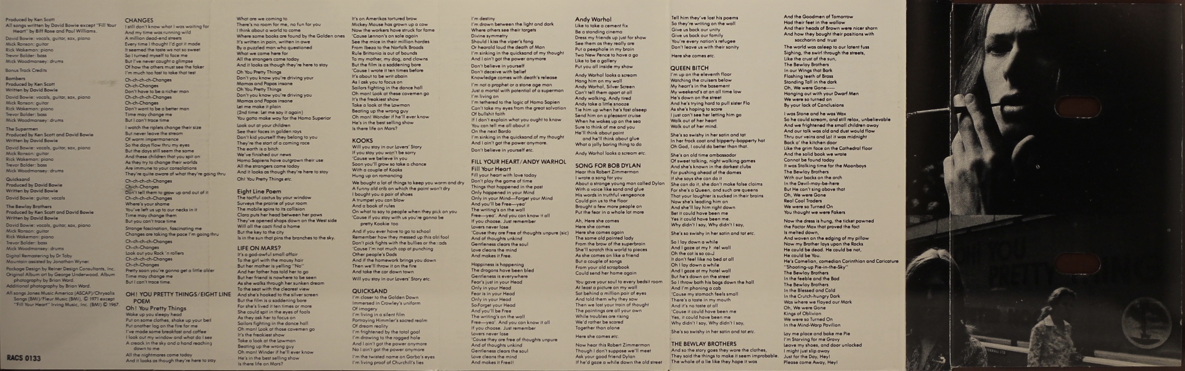 The track sequence has been slightly adjusted from the LP format so that tracks 1 and 2 from side 2 ‘Fill Your Heart’ and ‘Andy Warhol’ have been added as the last tracks on side 1 to give room for the bonus tracks: ‘Bombers’, ‘The Supermen – alternate version’, ‘Quicksand – demo version’ and ‘The Bewlay Brothers – alternate mix’ on side 2.