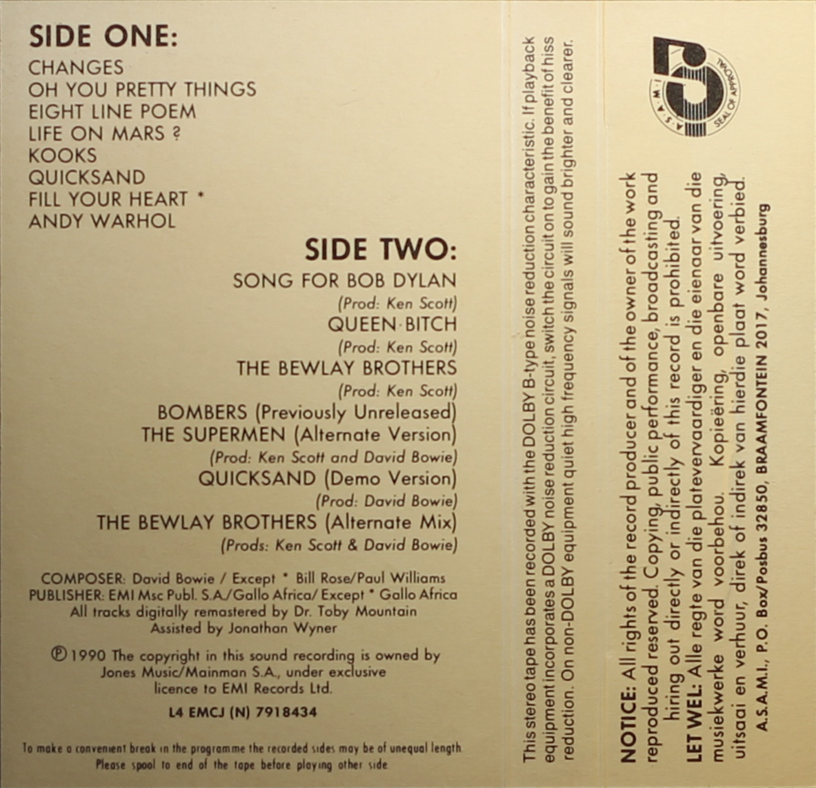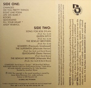 The track sequence has been slightly adjusted from the LP format so that tracks 2 and 3 from side 2 ‘Fill Your Heart’ and ‘Andy Warhol’ have been added as the last tracks on side 1 to give room for the bonus tracks: ‘Bombers’, ‘The Supermen – alternate version’, ‘Quicksand – demo version’ and ‘The Bewlay Brothers – alternate mix’ on side 2.