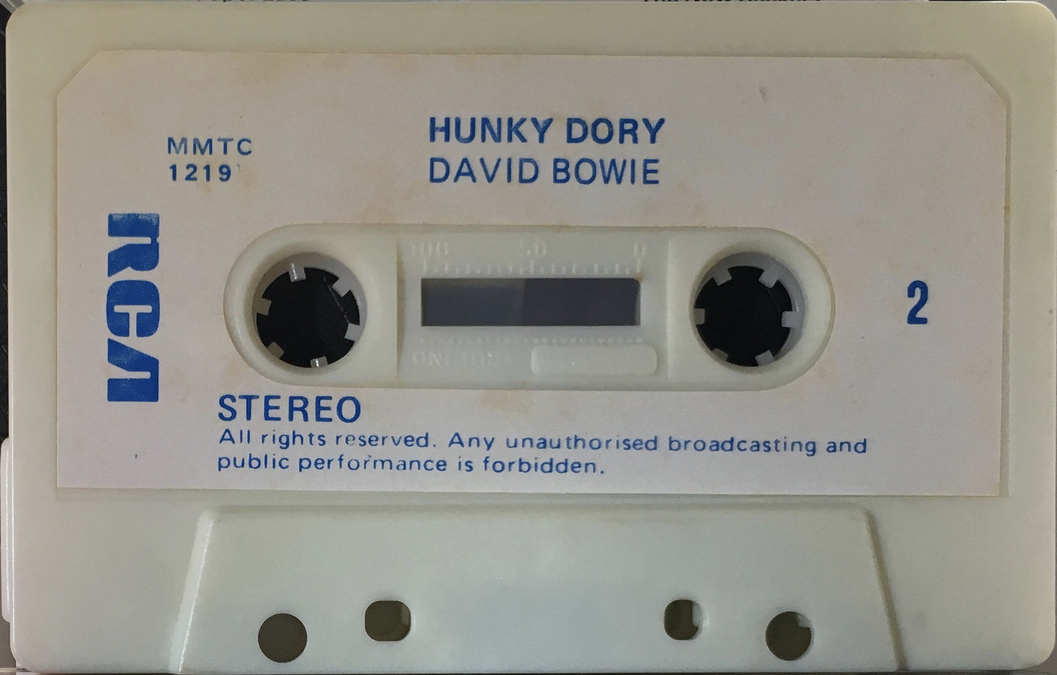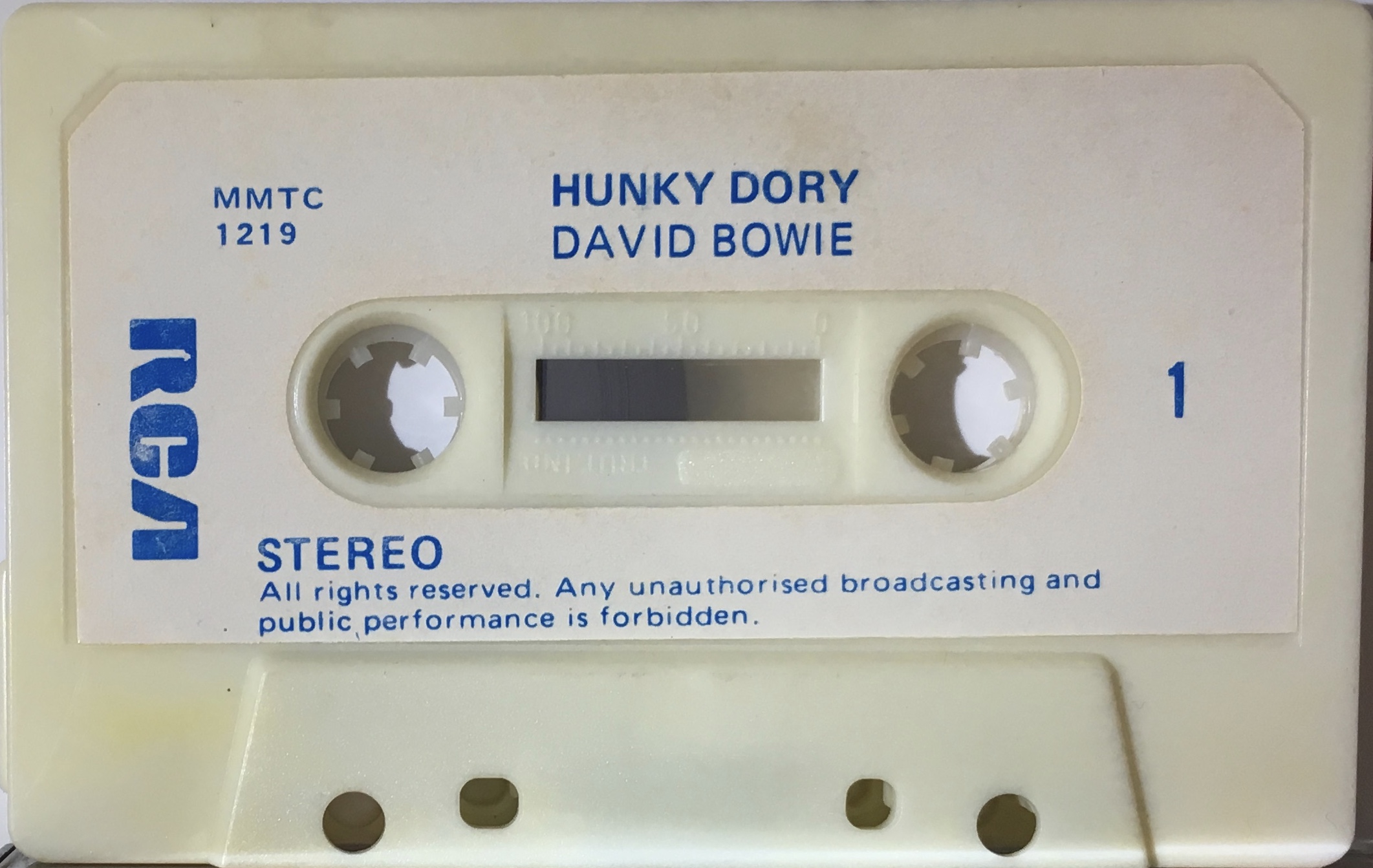 White cassette with blue ink printed onto white label, no rights logo shown.