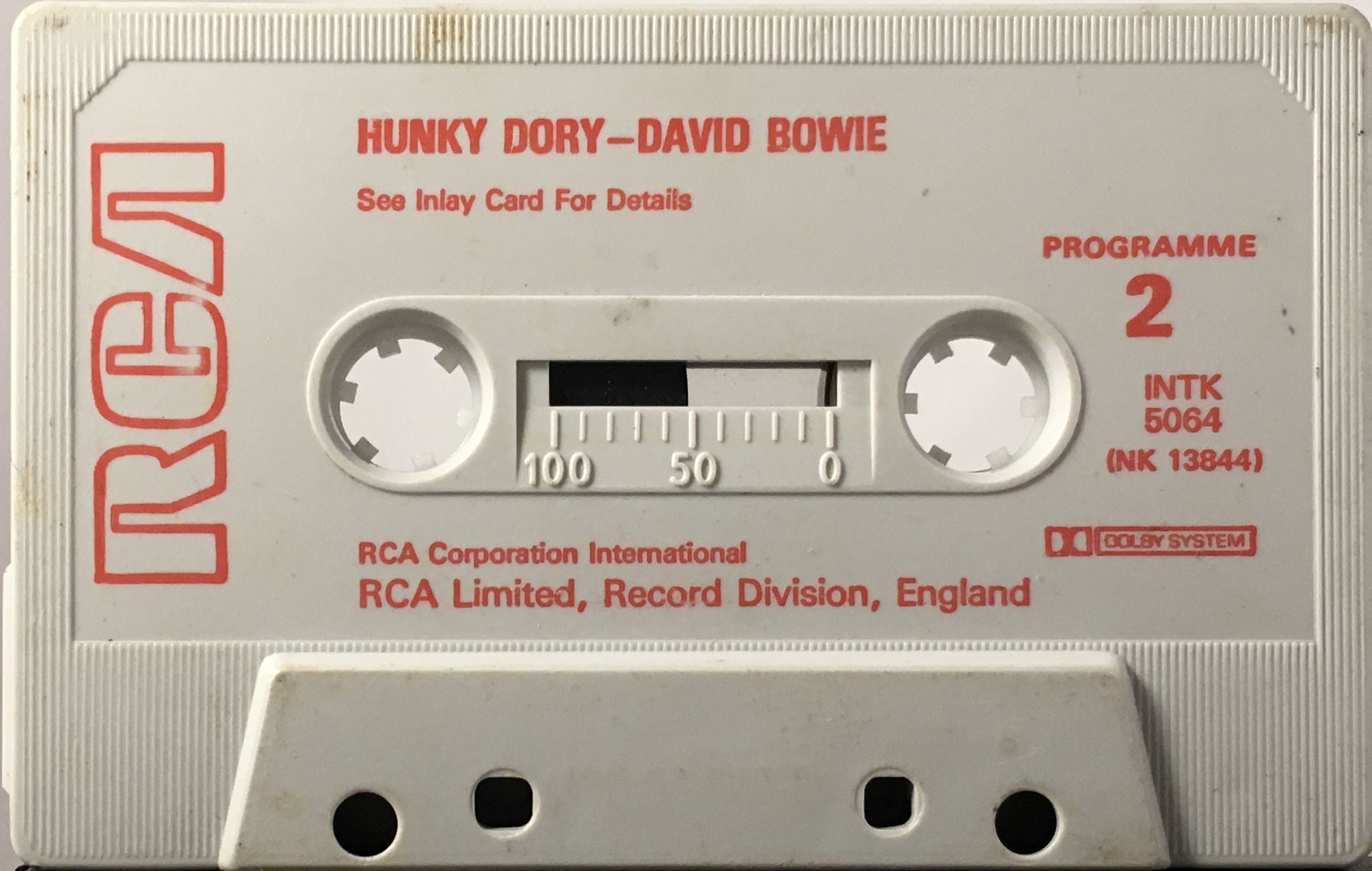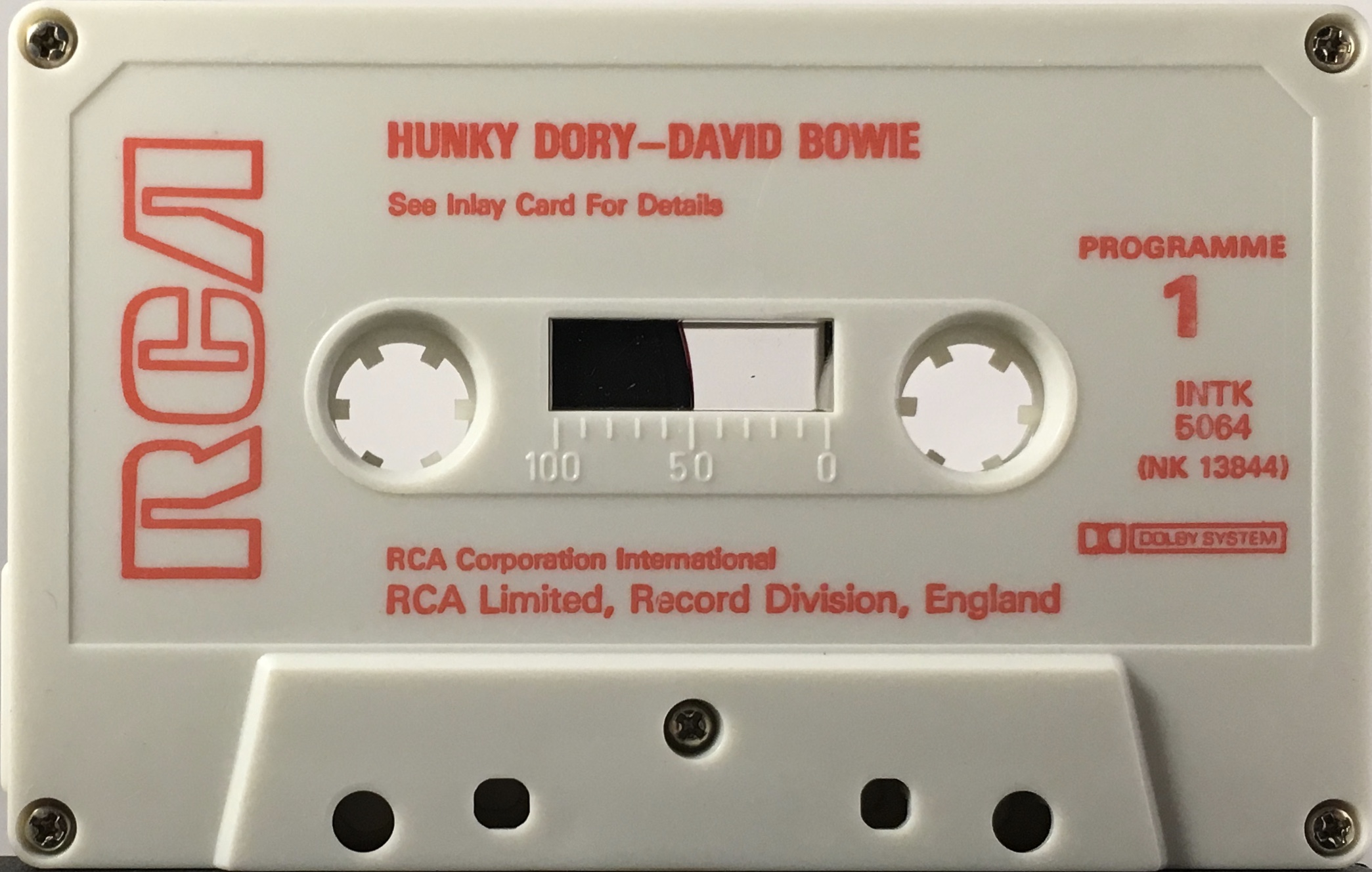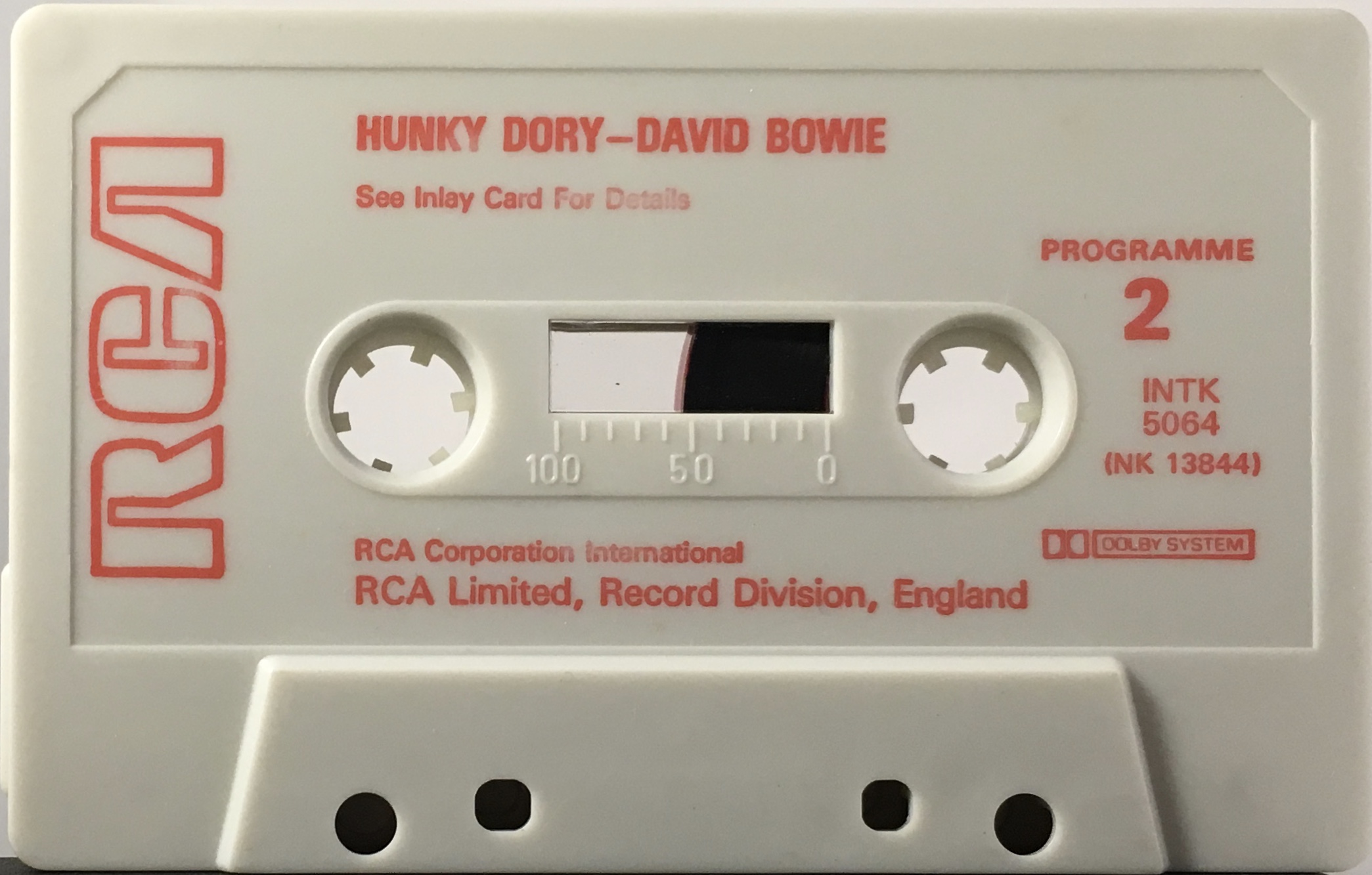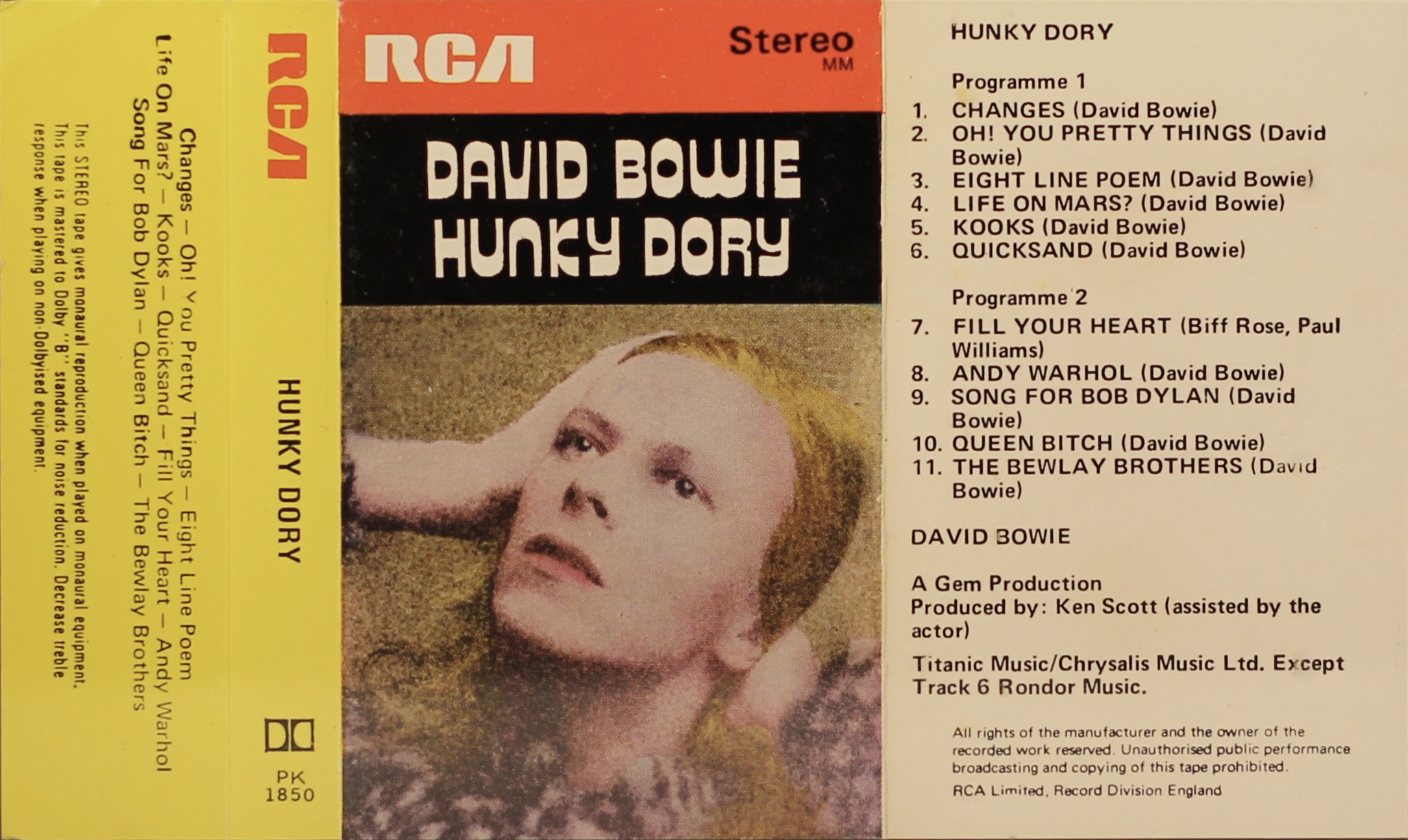 Red tab top, yellow spine and rear panel. The cover has ‘Stereo’ on the top right (no MM) and is made from thick folded paper. The cassette is white or grey with RCA orange labels and hollow, white RCA logo and PK 1850 over two lines. The rear of the cover is a black and white photograph of Bowie taken during the photo session used for the cover of ‘The Man Who Sold The World’.