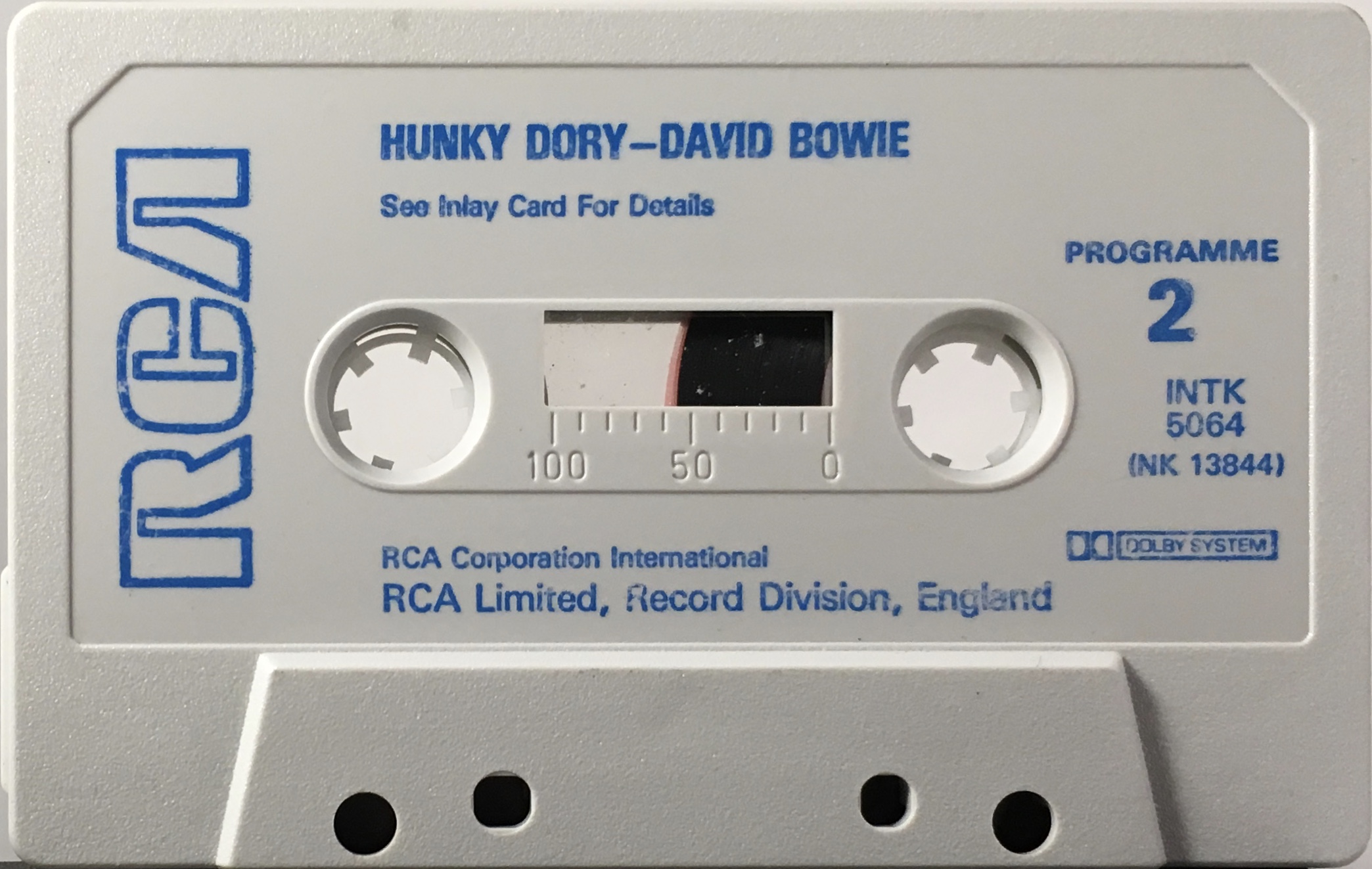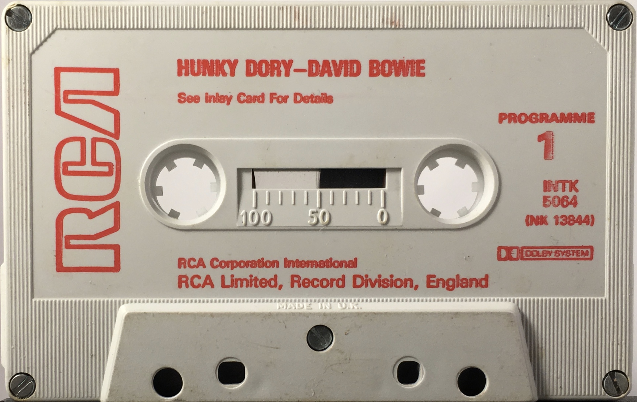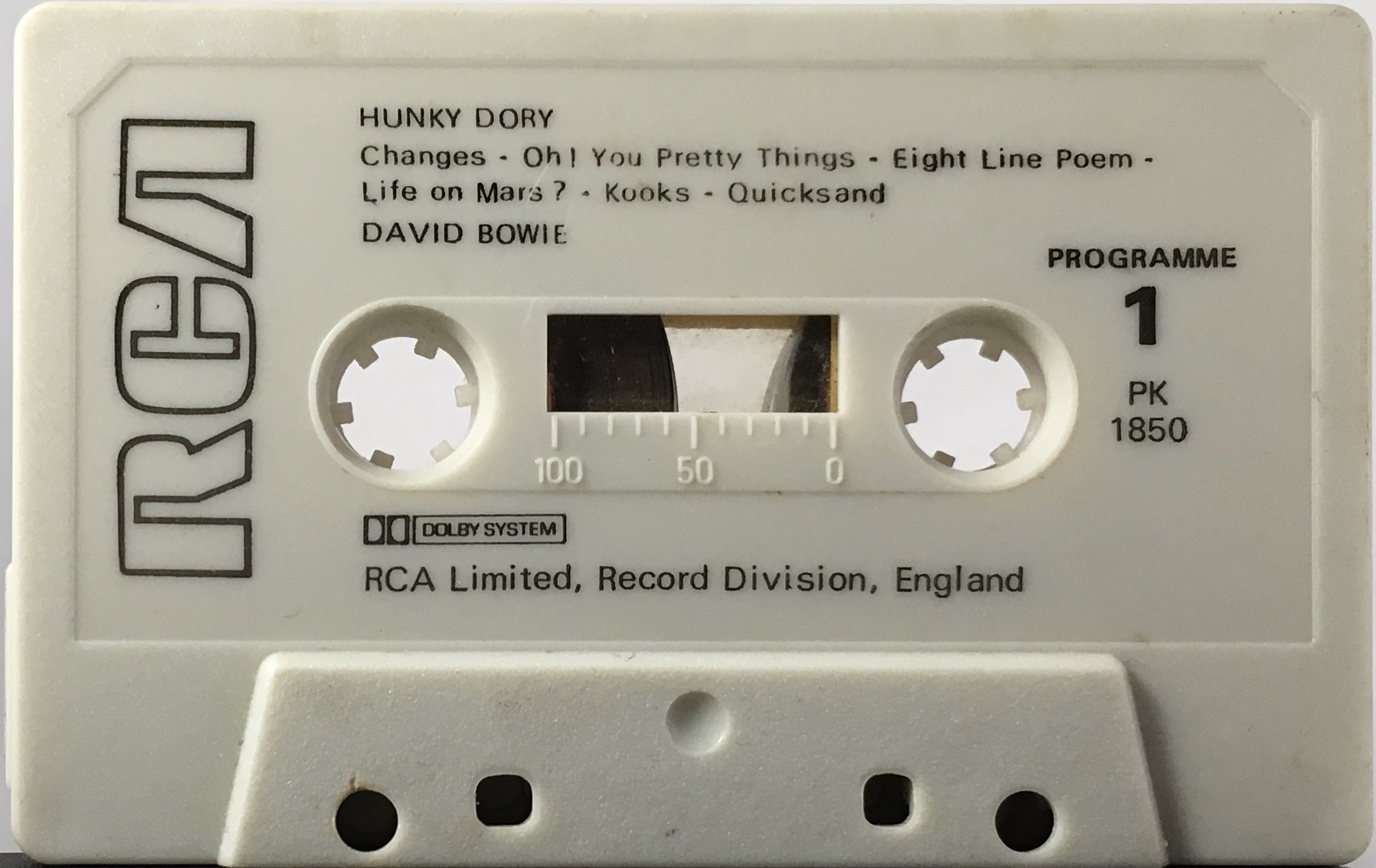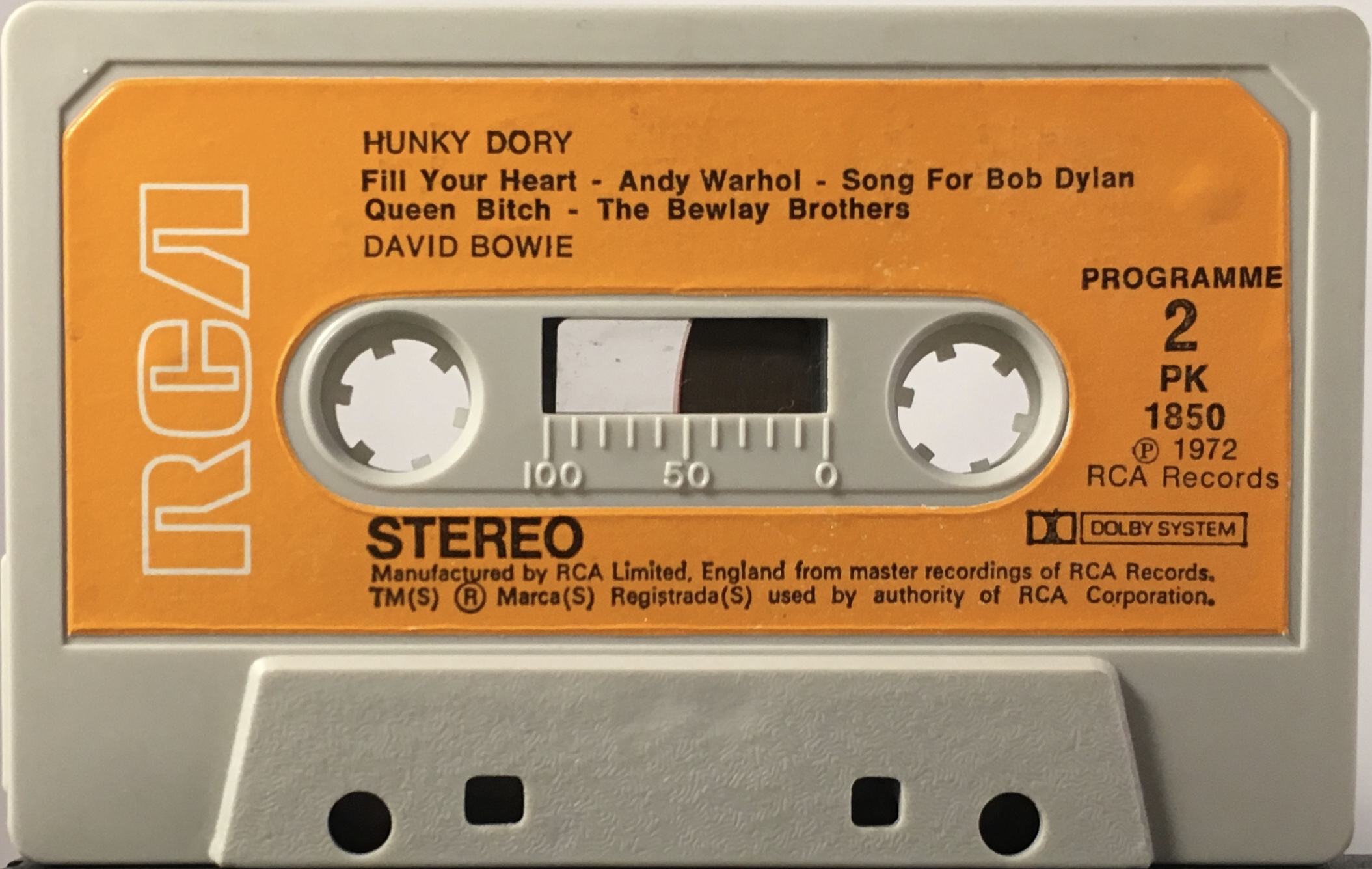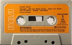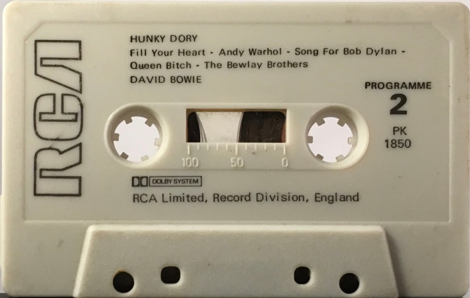 Red tab top, yellow spine and rear panel. The cover has ‘Stereo’ on the top right (no MM) and is made from thick folded paper. The cassette is white or grey with RCA orange labels and hollow, white RCA logo and PK 1850 over two lines. The rear of the cover is a black and white photograph of Bowie taken during the photo session used for the cover of ‘The Man Who Sold The World’.