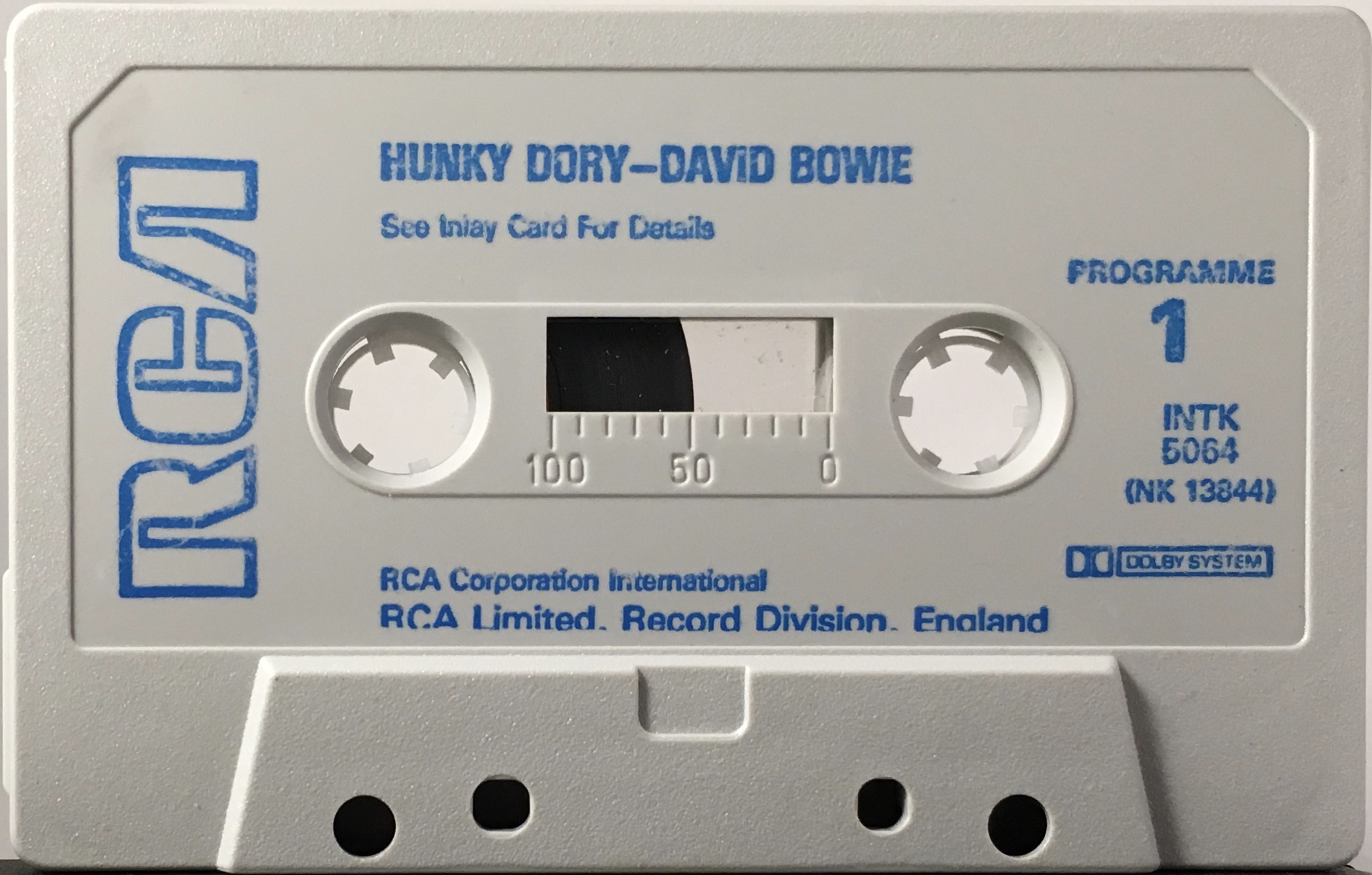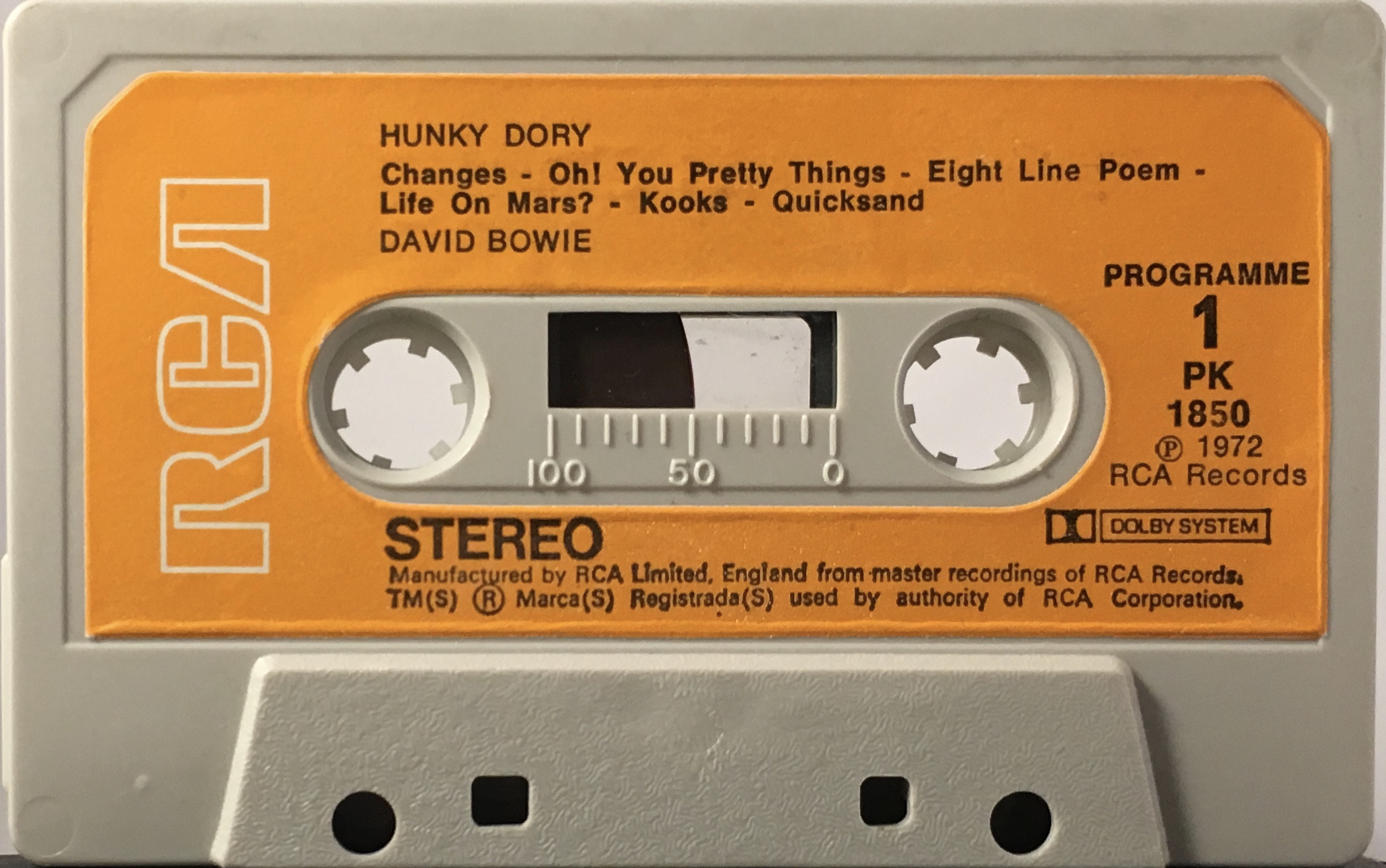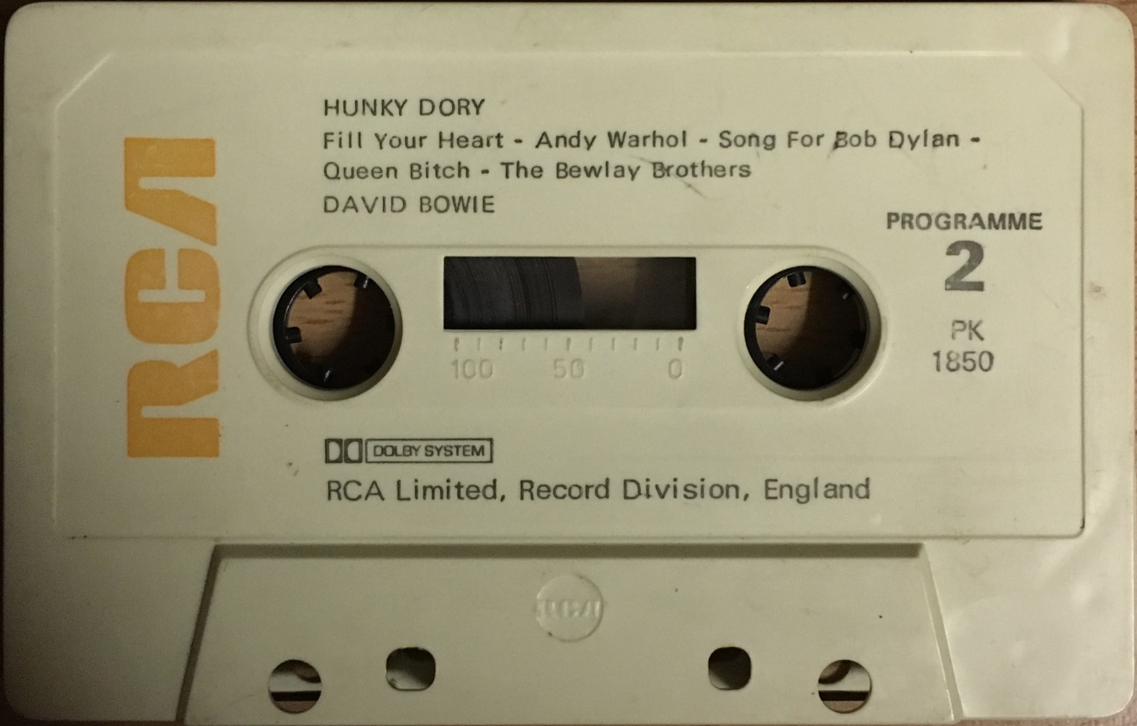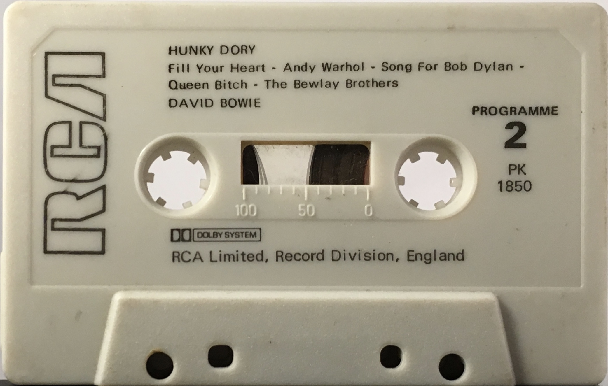 Red tab top, yellow spine and rear panel. The cover has ‘Stereo’ on the top right (no MM) and is made from thick folded paper. The cassette is white or grey with RCA orange labels and hollow, white RCA logo and PK 1850 over two lines. The rear of the cover is a black and white photograph of Bowie taken during the photo session used for the cover of ‘The Man Who Sold The World’.
