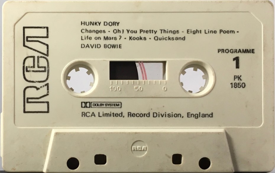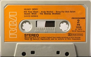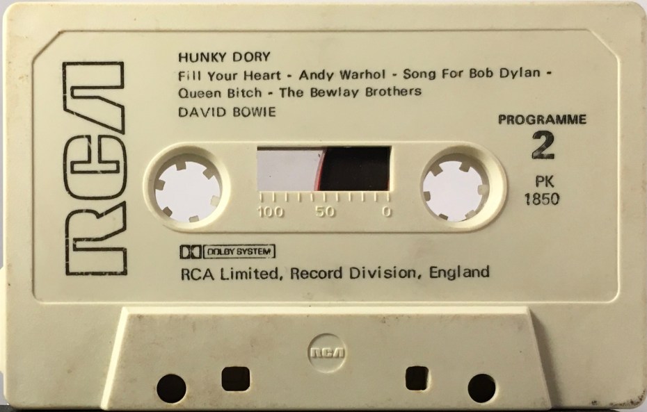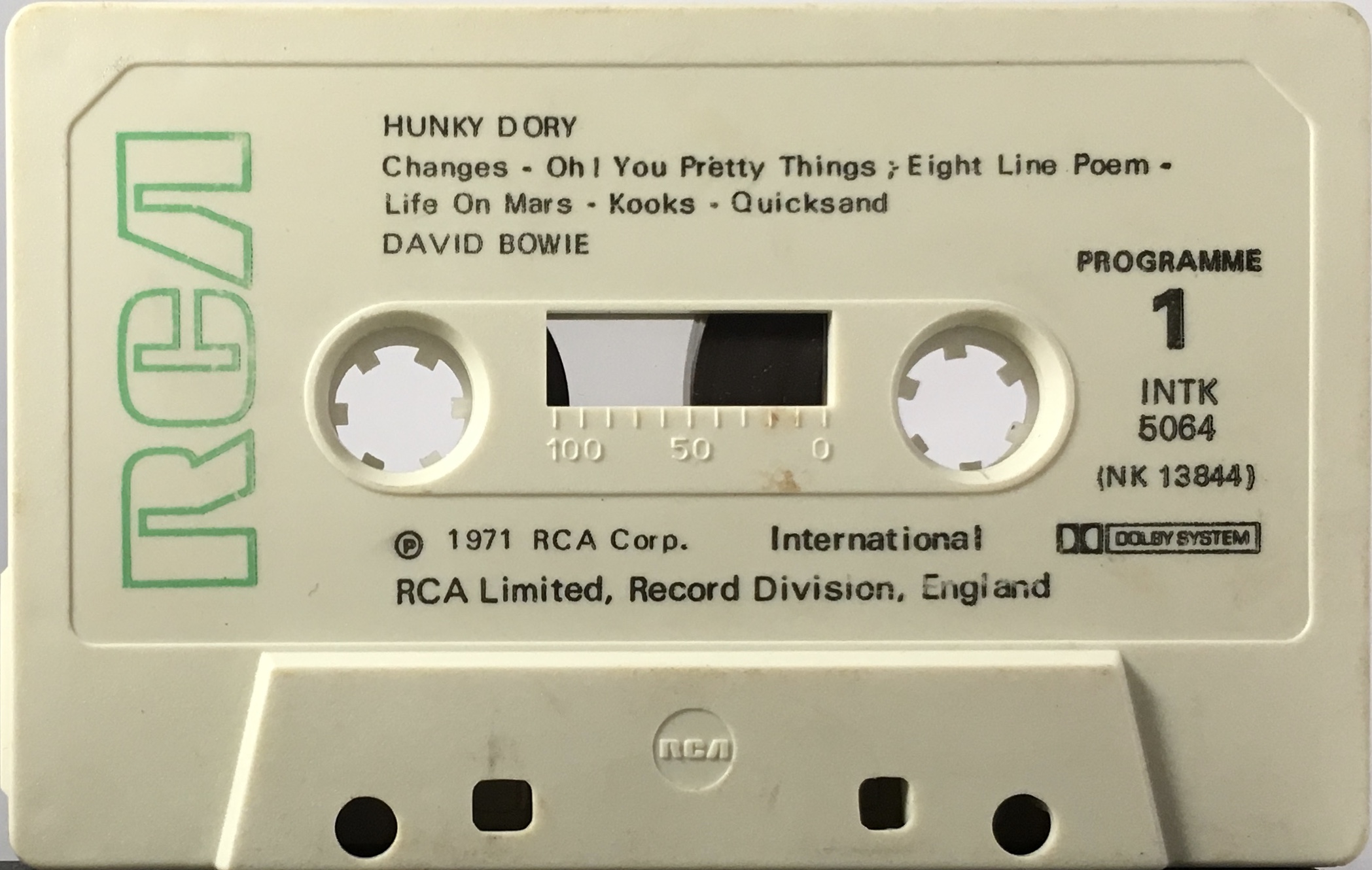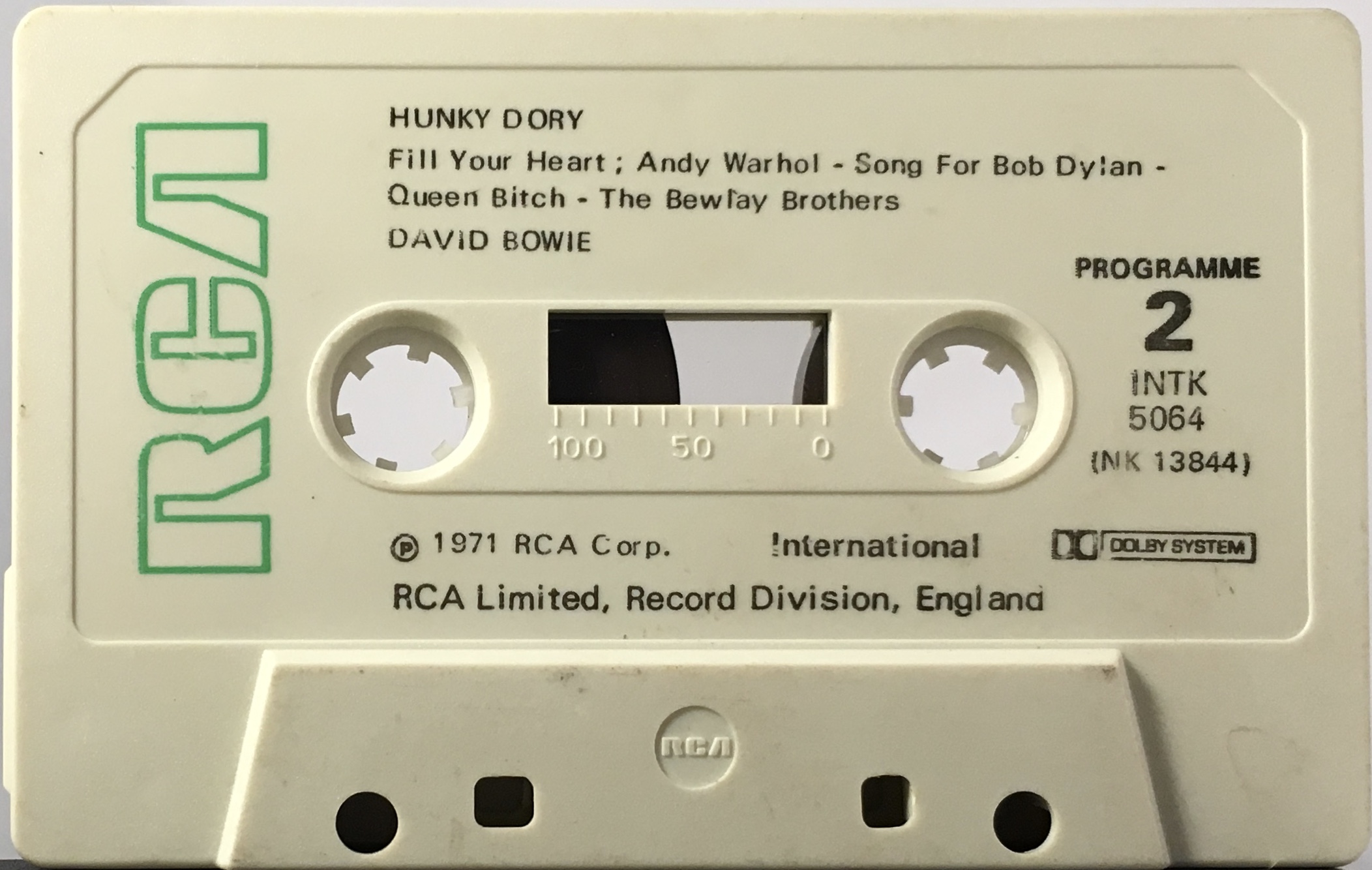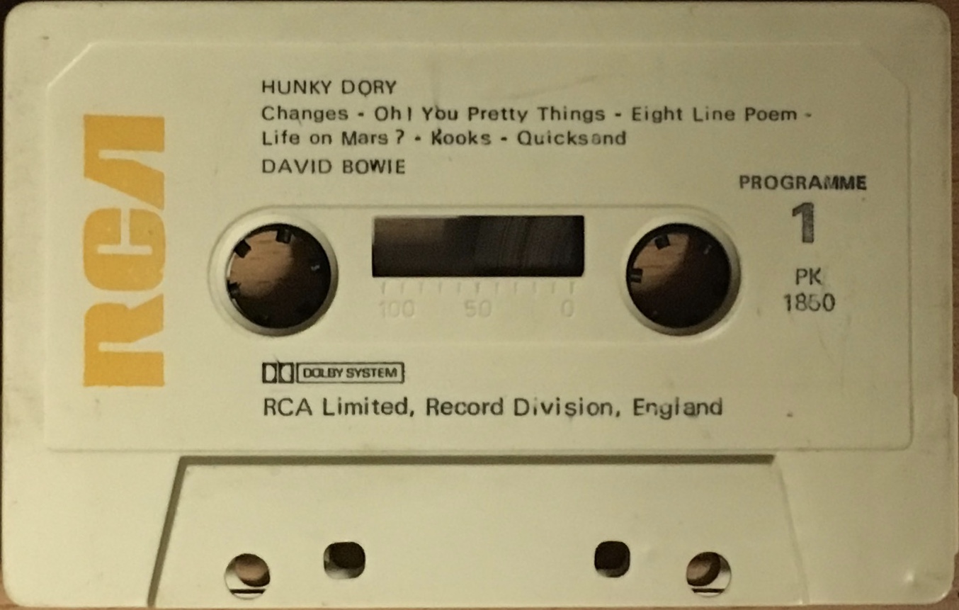 Red tab top, yellow spine and rear panel. The cover has ‘Stereo’ on the top right (no MM) and is made from thick folded paper. The cassette is white or grey with RCA orange labels and hollow, white RCA logo and PK 1850 over two lines. The rear of the cover is a black and white photograph of Bowie taken during the photo session used for the cover of ‘The Man Who Sold The World’.