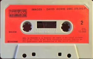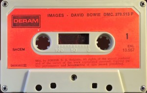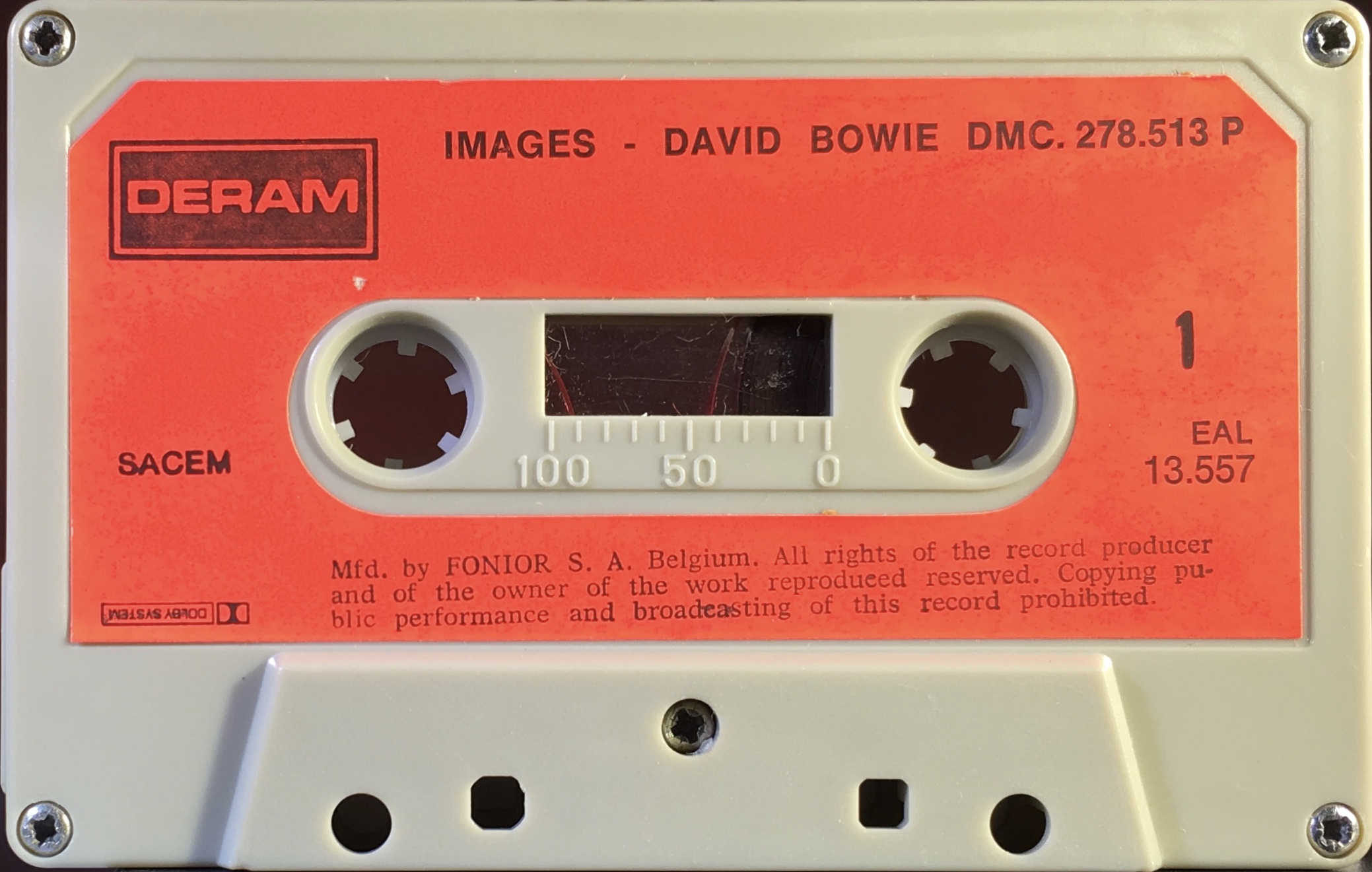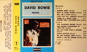 Cover photograph bordered by white frame and blue border. White rear and inner panels with yellow spine on folded, thick paper. Track list on rear and inner panels. The rear of the cover is blank. Also referred to as David Bowie (Mille Pattes Series) this cassette has only the tracks from the first two sides of that issue.