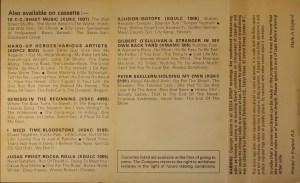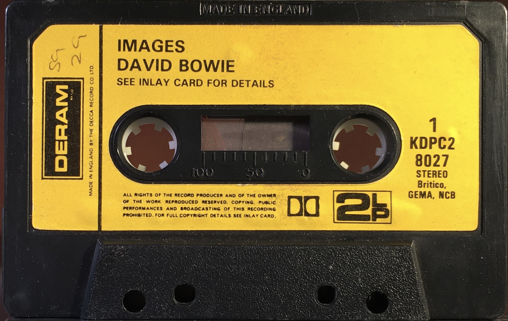Black ink on yellow paper label onto grey shell or black shell; BRITCO/ GEMA/ NCB rights, Dolby and boxed ‘2LP’ sign – thinner numbers. Made In England stamped case.