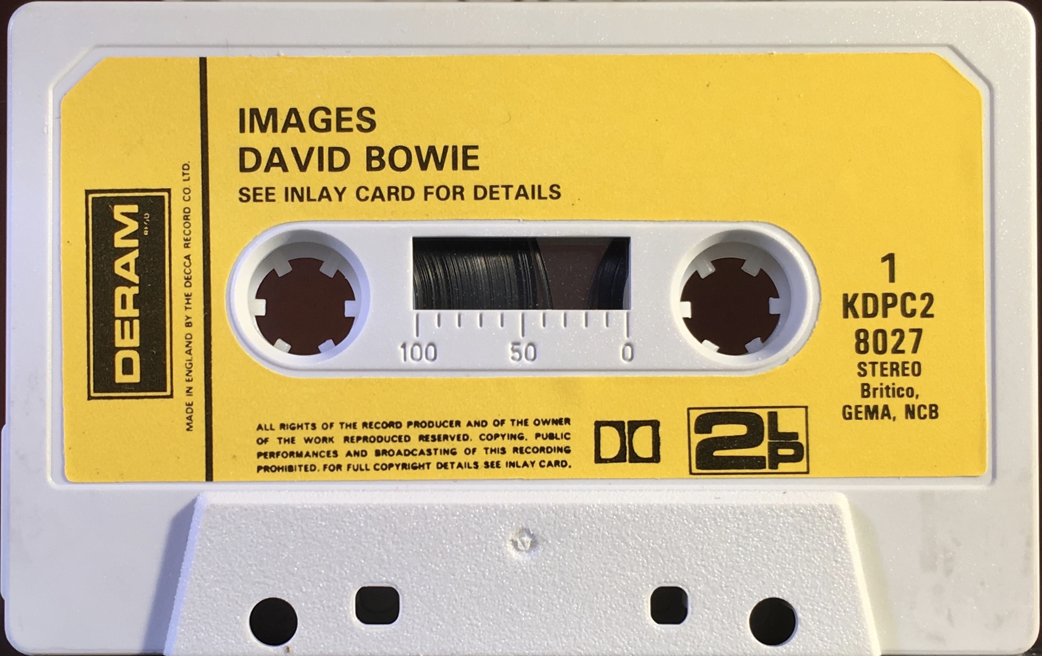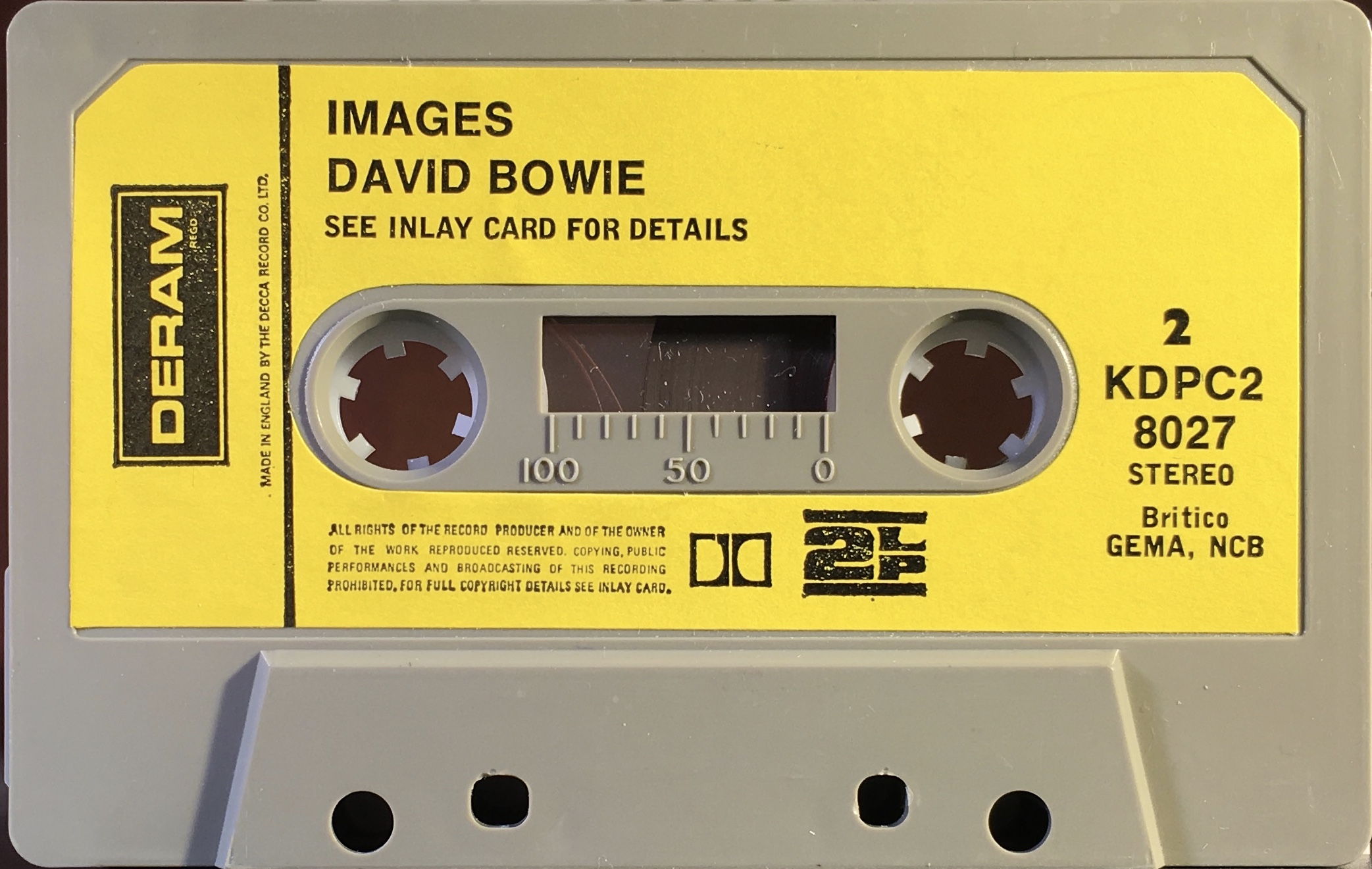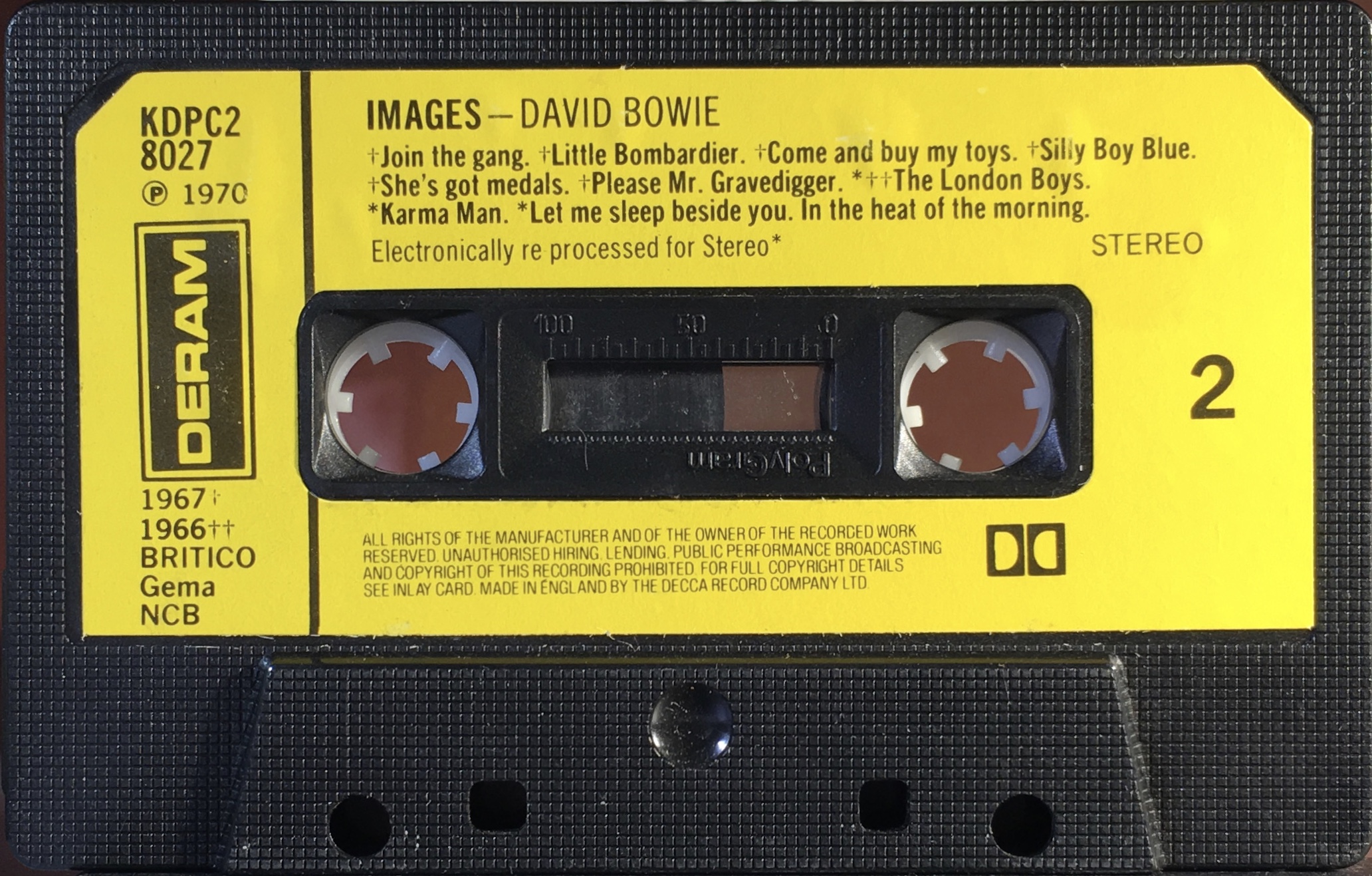 Black ink on yellow paper label onto grey shell; BRITCO/ GEMA/ NCB rights, Dolby and ‘2LP’ sign. This is the only issue to have the date 1970 on the label; however it is on a stock PolyGram cassette shell and as Deram was not part of them until 1980 it must have been released sometime between then and 1990’s Startrax Rock Reflections. New layout to label.