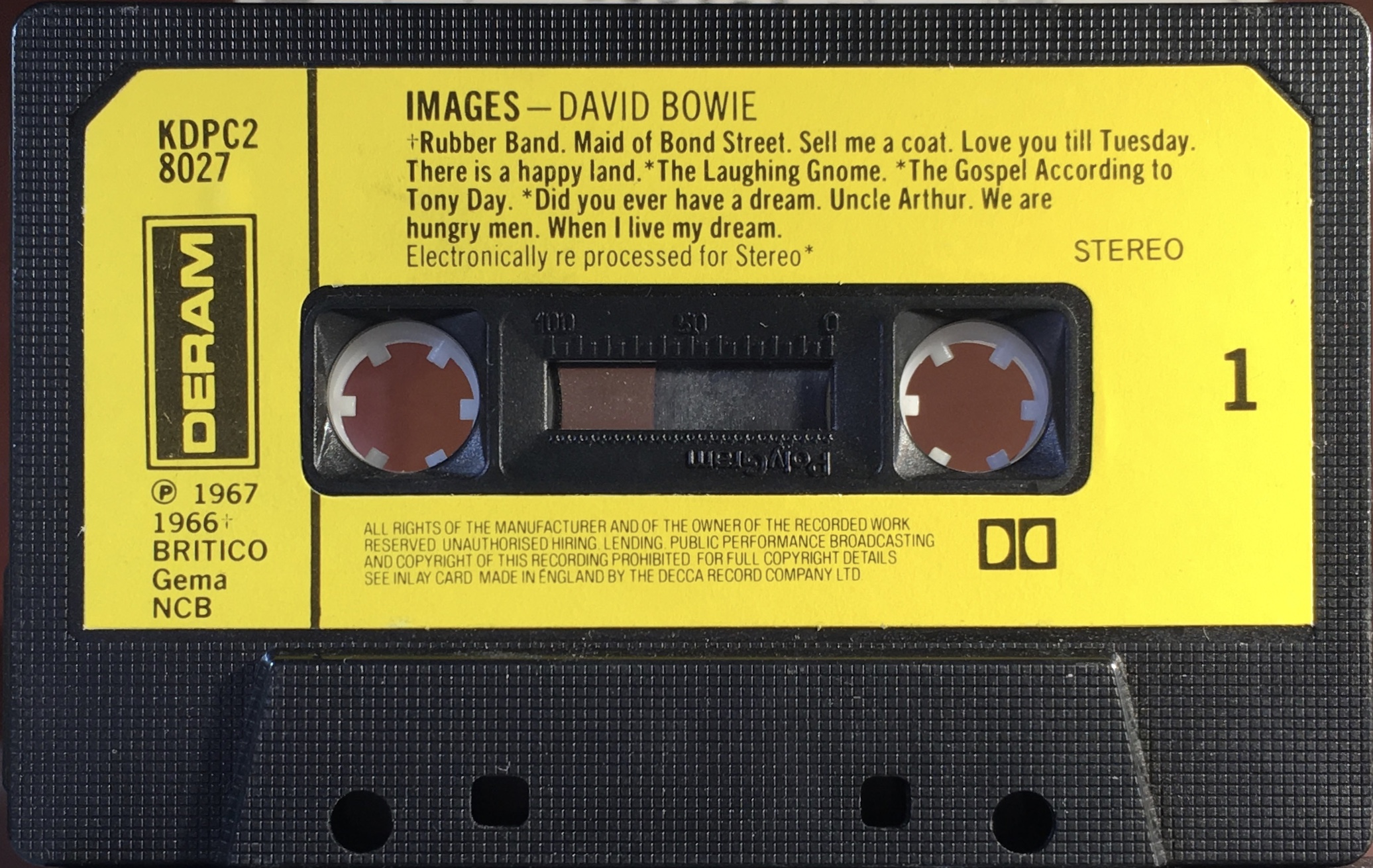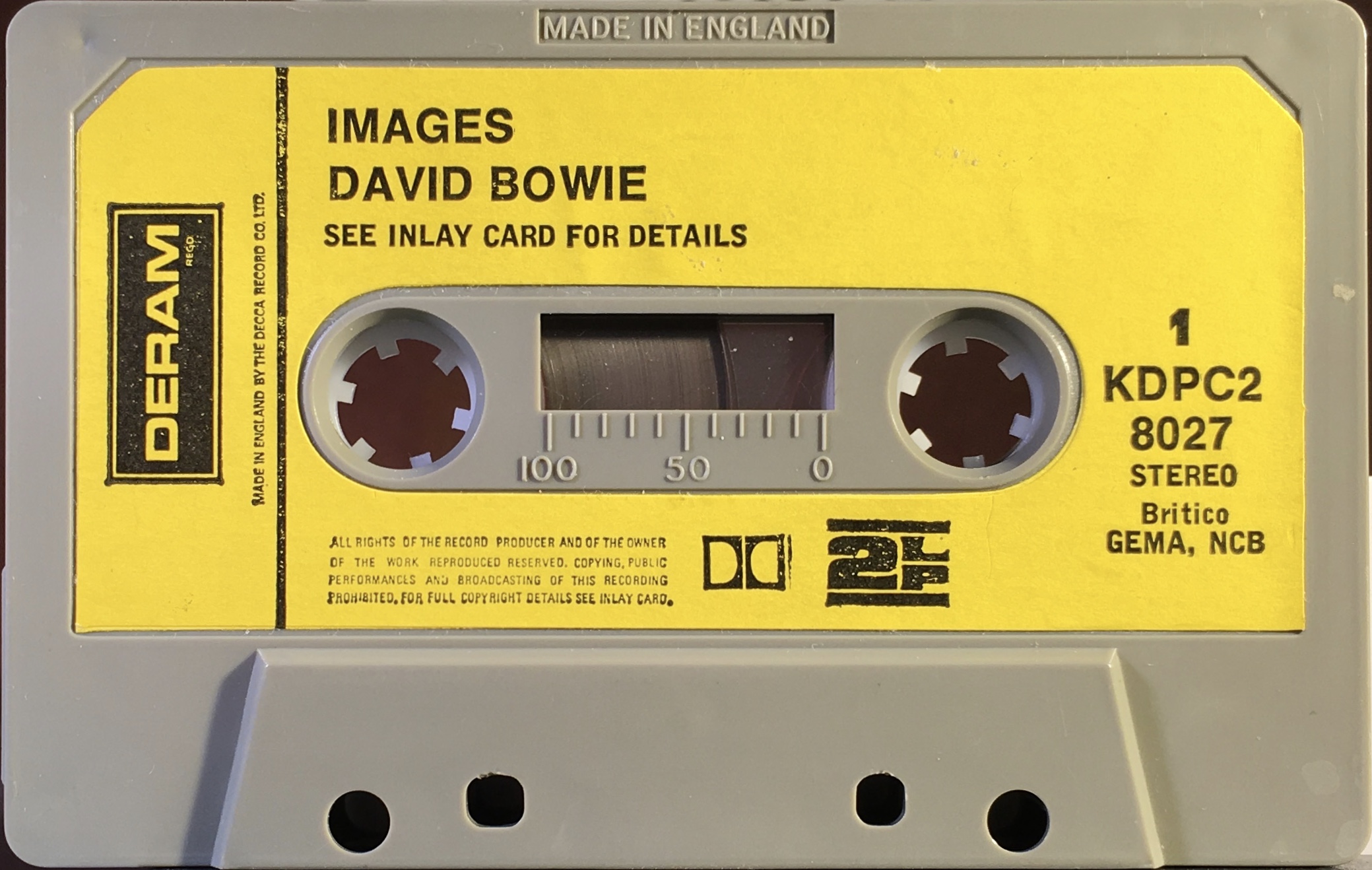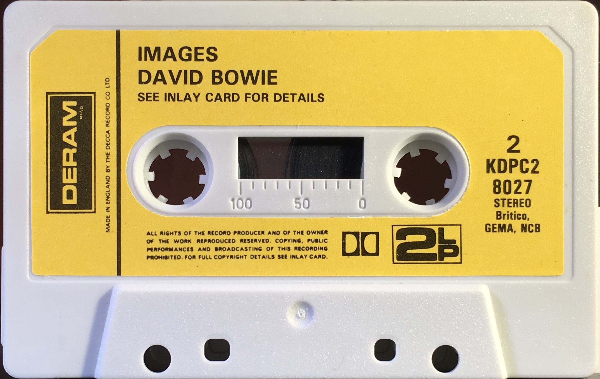 Black ink on yellow paper label onto grey shell; BRITCO/ GEMA/ NCB rights, Dolby and ‘2LP’ sign. This is the only issue to have the date 1970 on the label; however it is on a stock PolyGram cassette shell and as Deram was not part of them until 1980 it must have been released sometime between then and 1990’s Startrax Rock Reflections. New layout to label.