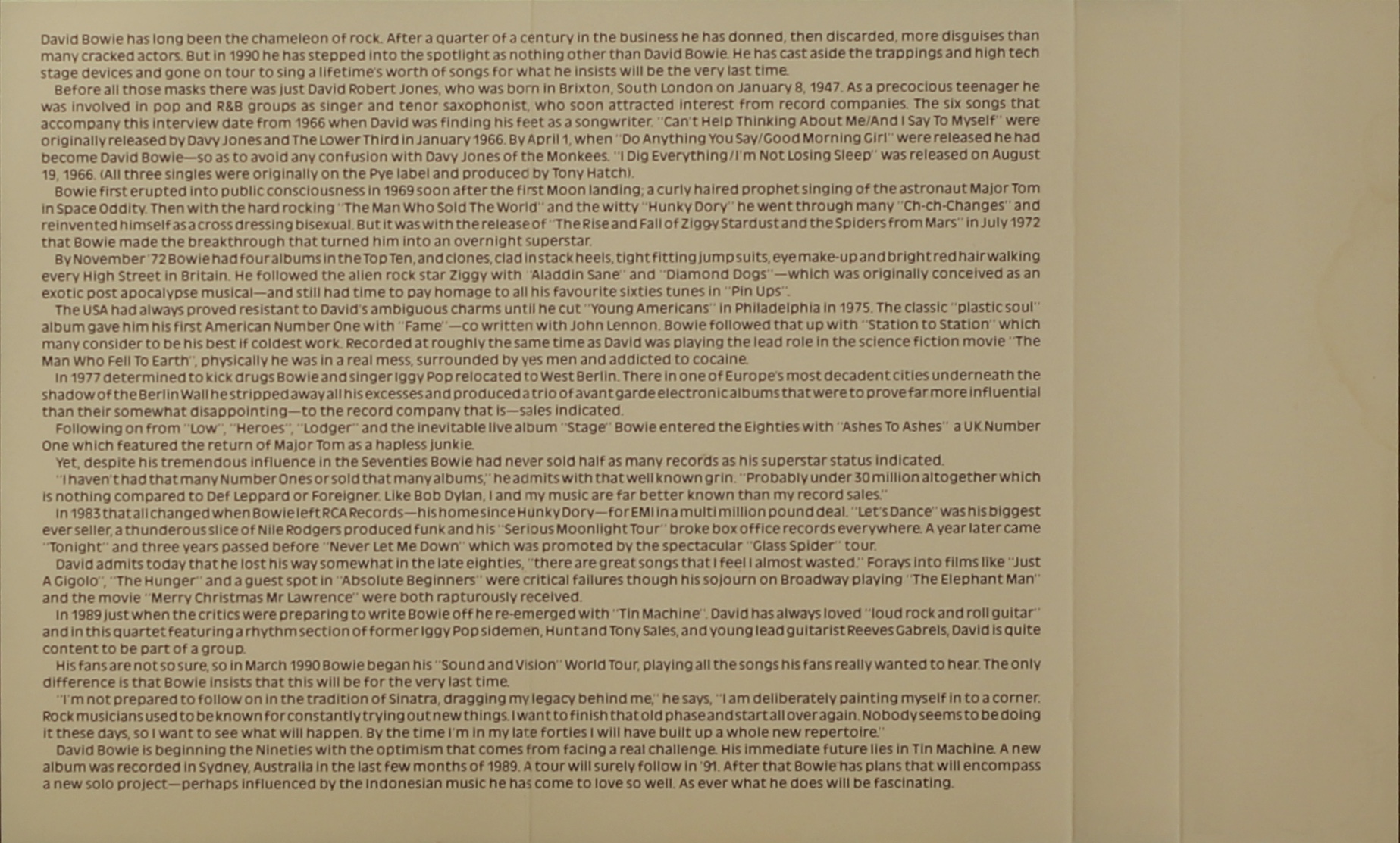 Side 1 is about 19m.30s long covers: smoking; tour preparation; Tin Machine; Pixies; The Sound + Vision and Glass Spider tour; a defence of his 1980’s output.