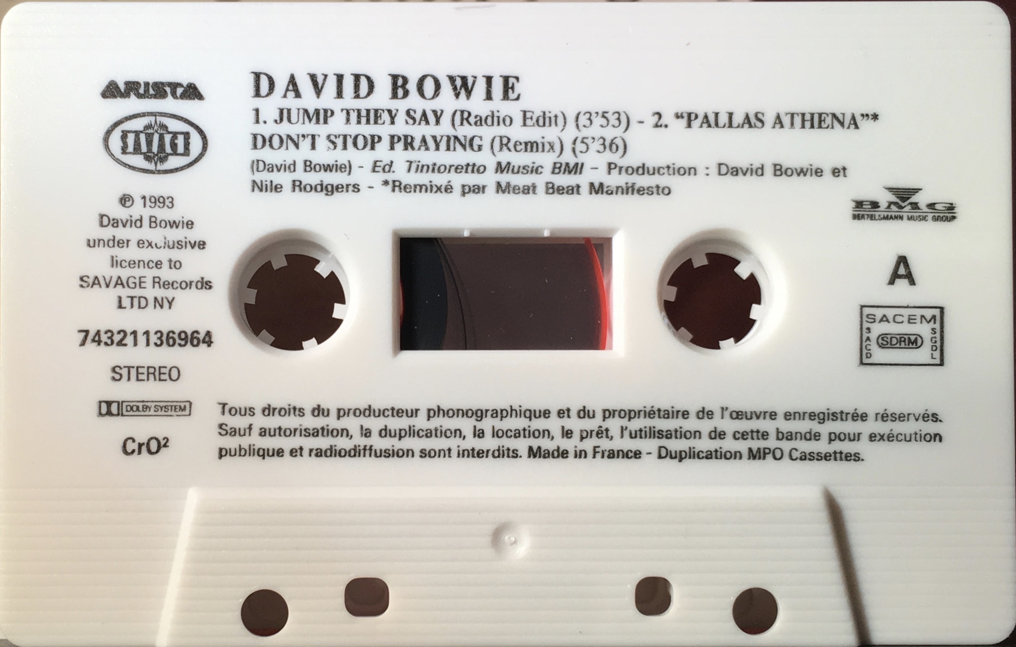 Black ink printed directly onto white shell and CrO2 tape, with SACEM rights and ‘Arista’, ‘Savage’ and ‘BMG’ logos. ‘Remixé par Meat Beat Manifesto’ for ‘Pallas Athena’.
