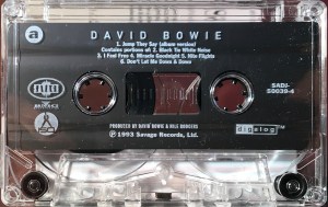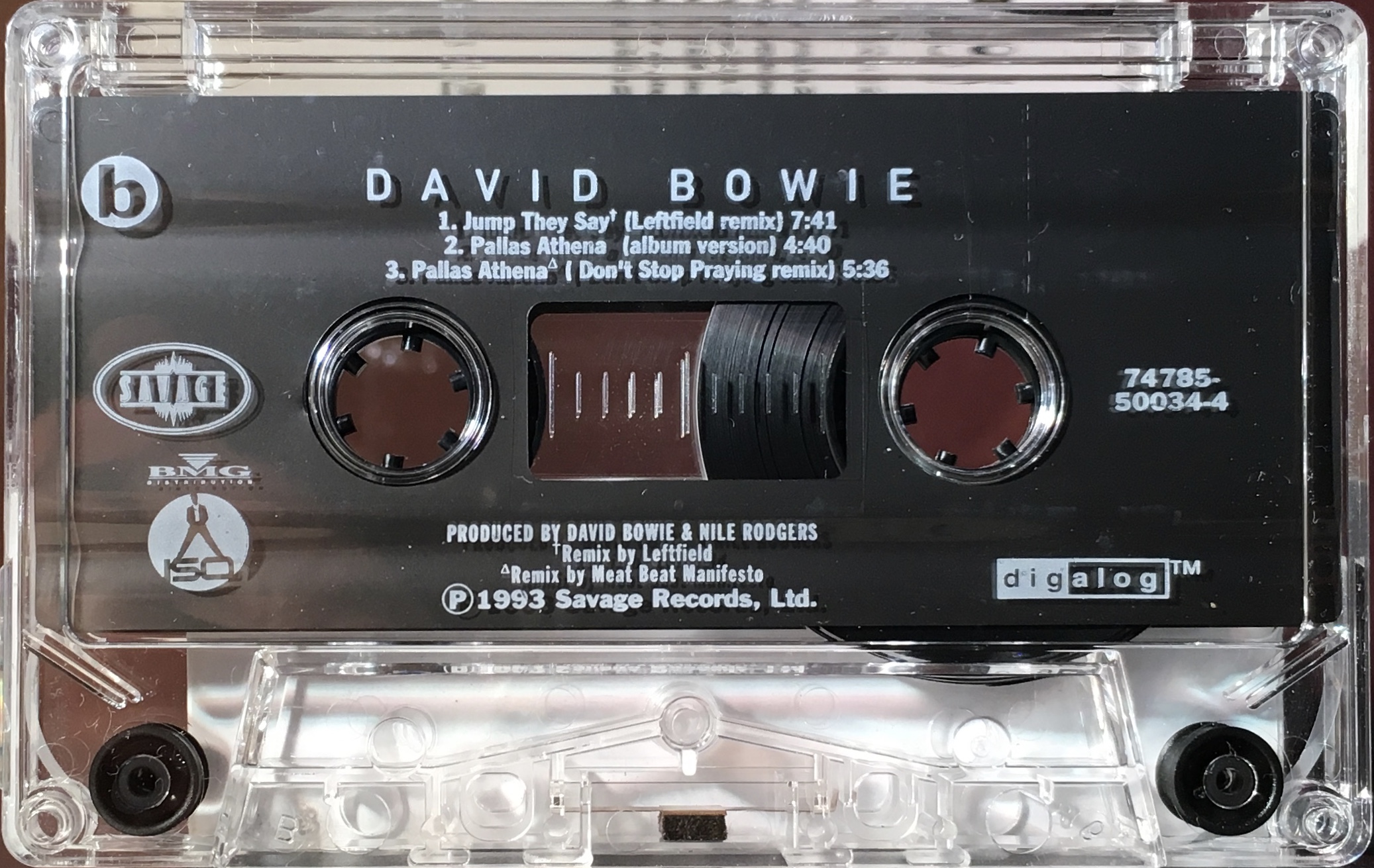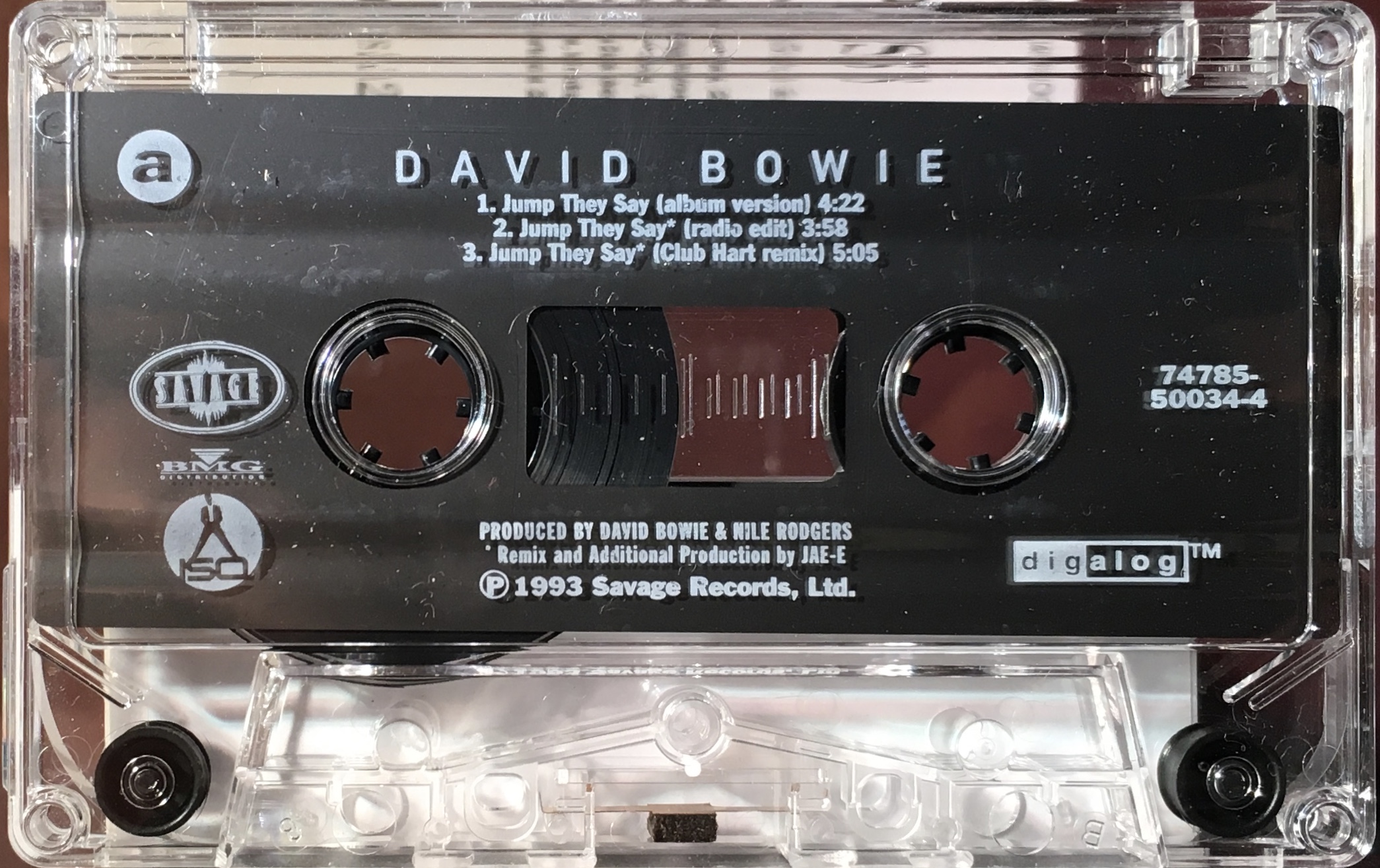 White ink printed directly onto clear shell with plain slip sheet and ‘Savage’, ‘BMG’ ‘Digalog’ and ‘ISO’ logos on shell. ‘Jump They Say’ is approx 4:22 long; Black Tie White Noise (1:55); I Feel Free (1:50); Miracle Goodnight (1:53); Nite Flights (1:58); Don’t Let Me Down & Down (2:01) rather than being portions of the individual tracks are the complete track edited down to the times shown.