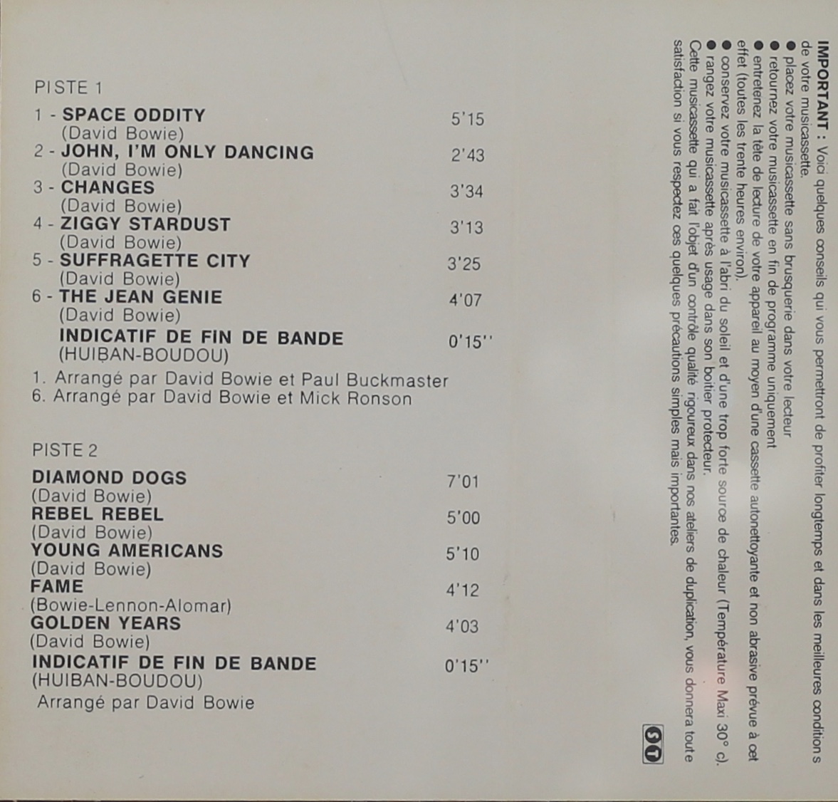 Side 1: Space Oddity; John, I’m Only Dancing; Changes; Ziggy Stardust; Suffragette City; The Jean Genie.