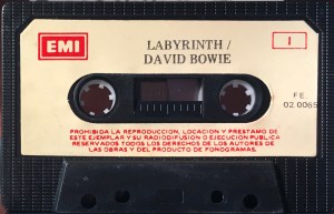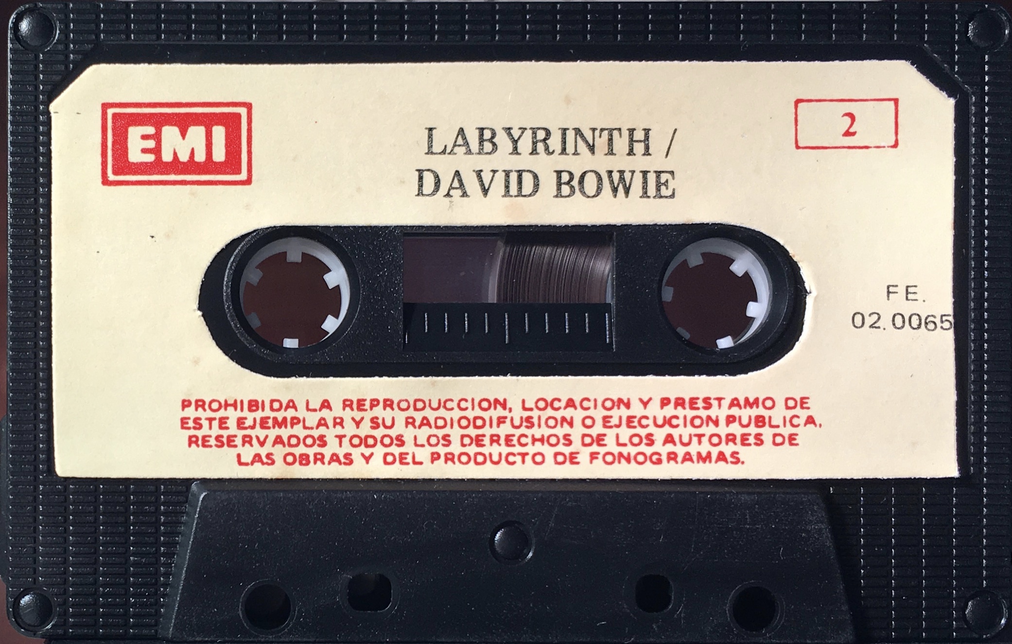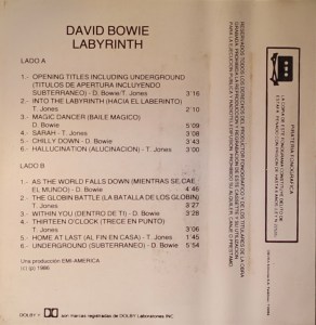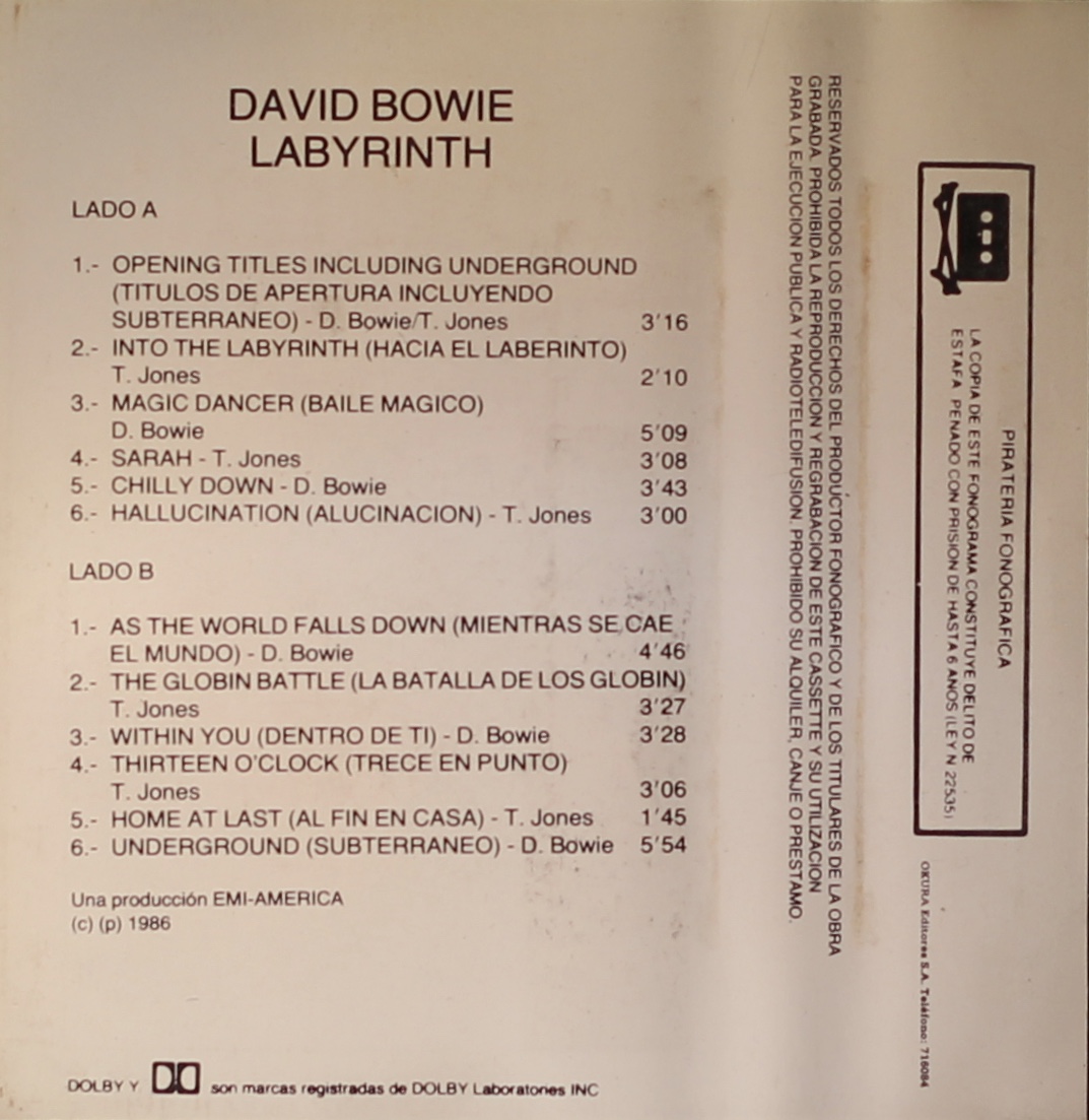 David Bowie performs on six tracks: ‘Opening Titles Including Underground’, (Titulos de apertura incluyendo Subterraneo) ‘Magic Dance’ (Baile magico) and ‘Chilly Down’ on Side 1; and ‘As The World Falls Down’ (Mientras se cae el mundo), ‘Within You’ (Dentro de ti) and ‘Underground’ (Subterraneo) on Side 2.