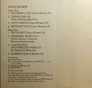 Side 1: Modern Love; China Girl; Let’s Dance; Without You.