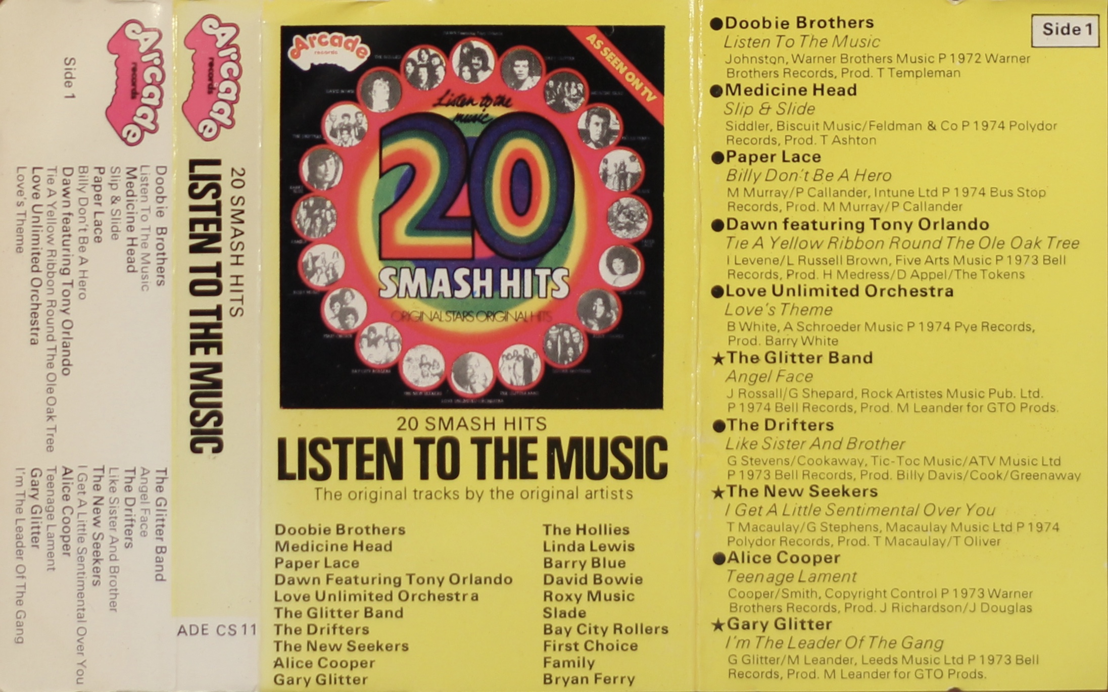 Listen To The Music – 20 Smash Hits: UK; Arcade, ADE CS 11; 1974.