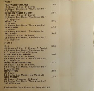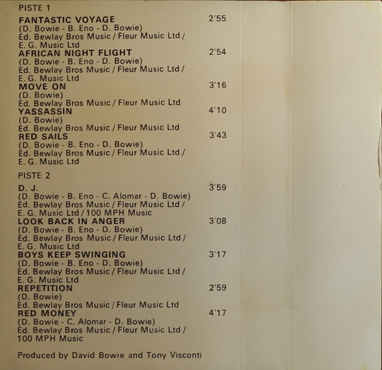 Side 2: D.J.; Look Back In Anger; Boys Keep Swinging; Repetition; Red Money.