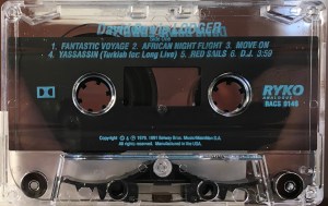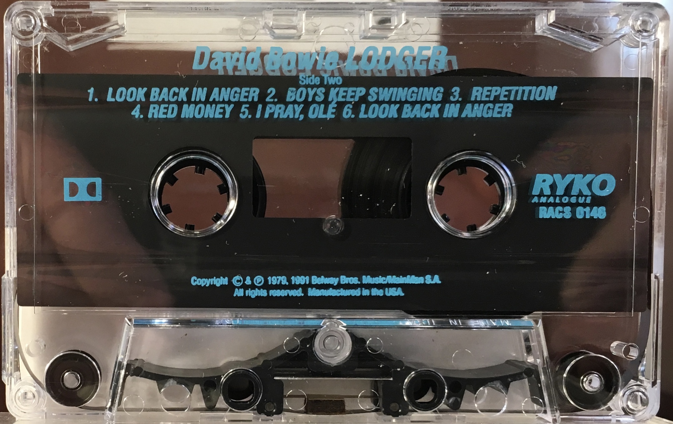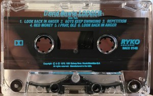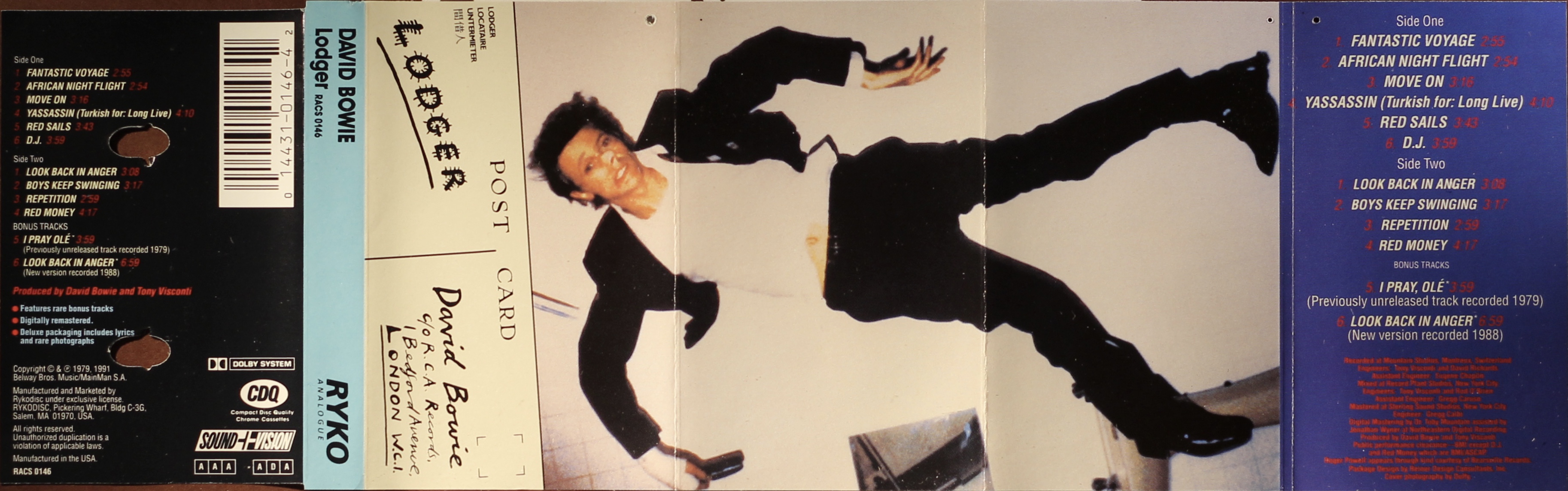 RYKO cassette on chrome tape boasting CDQ (Compact Disc Quality), blue ink printed directly onto clear shell. The cover (J-card) can be identified on the USA RYKO stock releases as the last panel which forms the rear of the box is shorter than the rest of the cover.