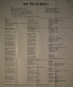 Side 1: Speed Of Life; Breaking Glass; What In The World; Sound And Vision; Always Crashing In The Same Car; Be My Wife; A New Career In A New Town.