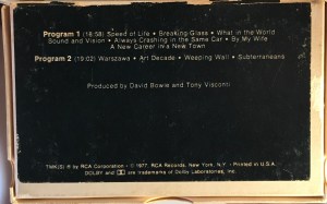 Side 1: Speed Of Life; Breaking Glass; What In The World; Sound And Vision; Always Crashing In The Same Car; Be My Wife; A New Career In A New Town.
