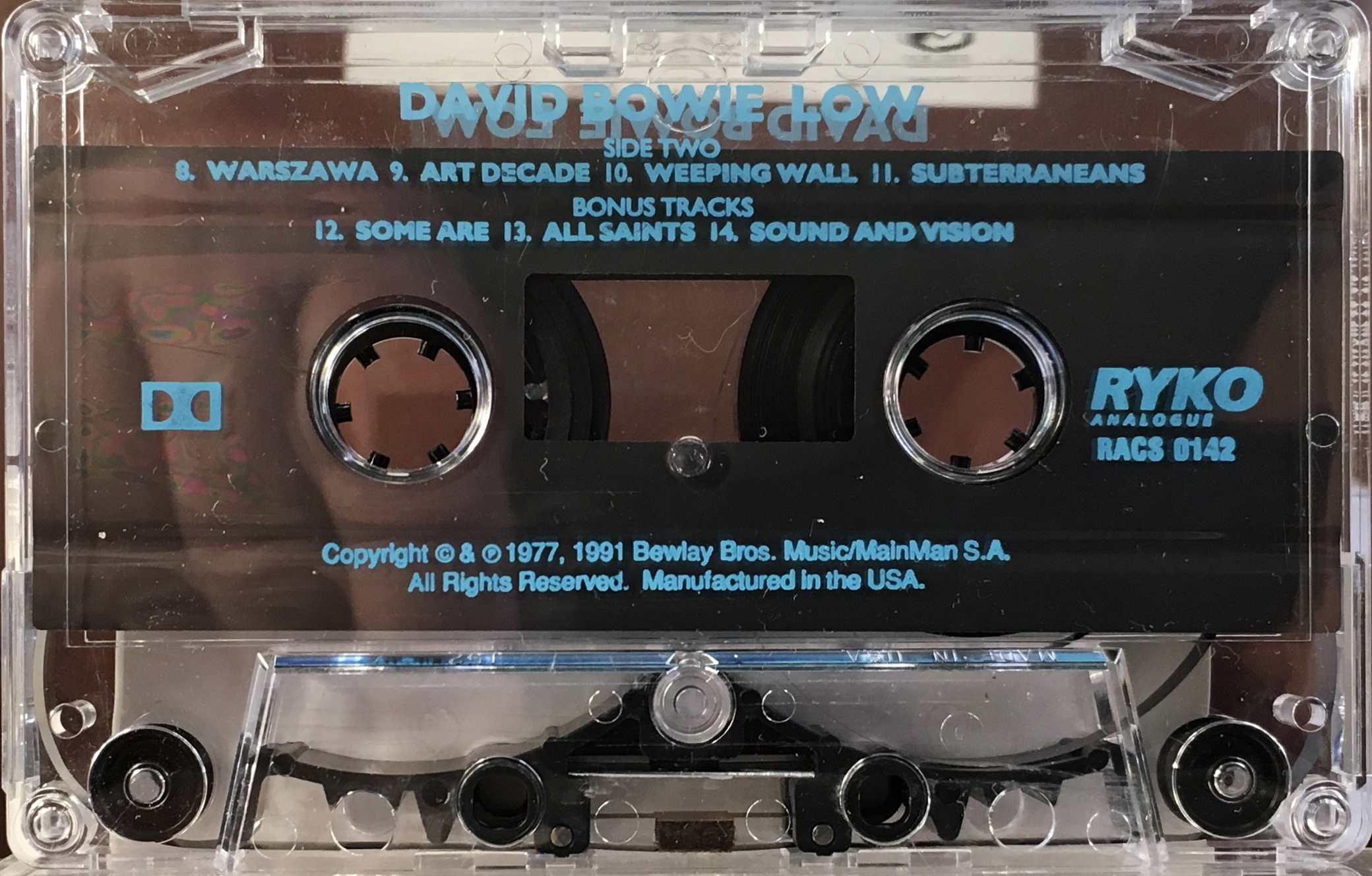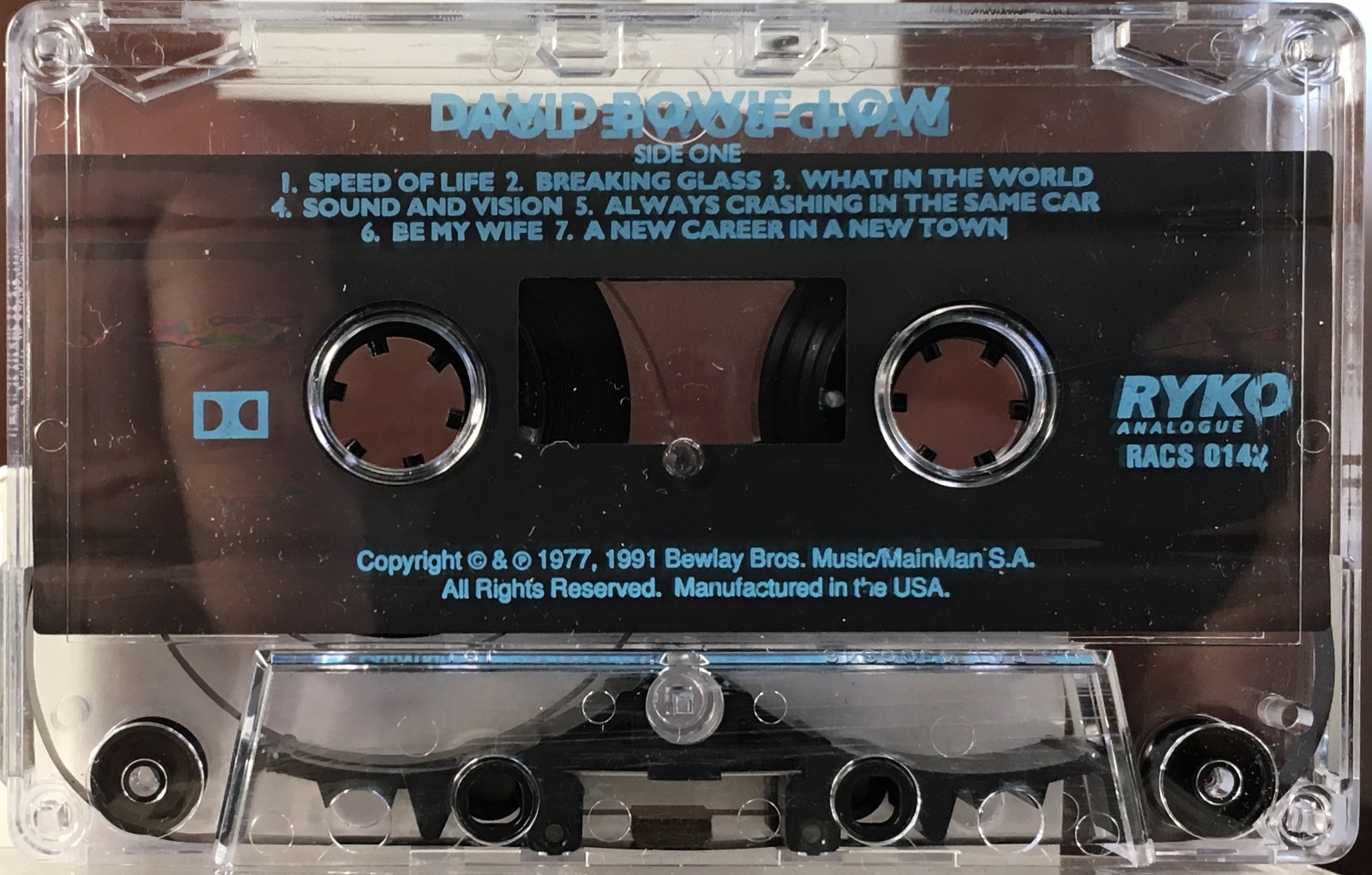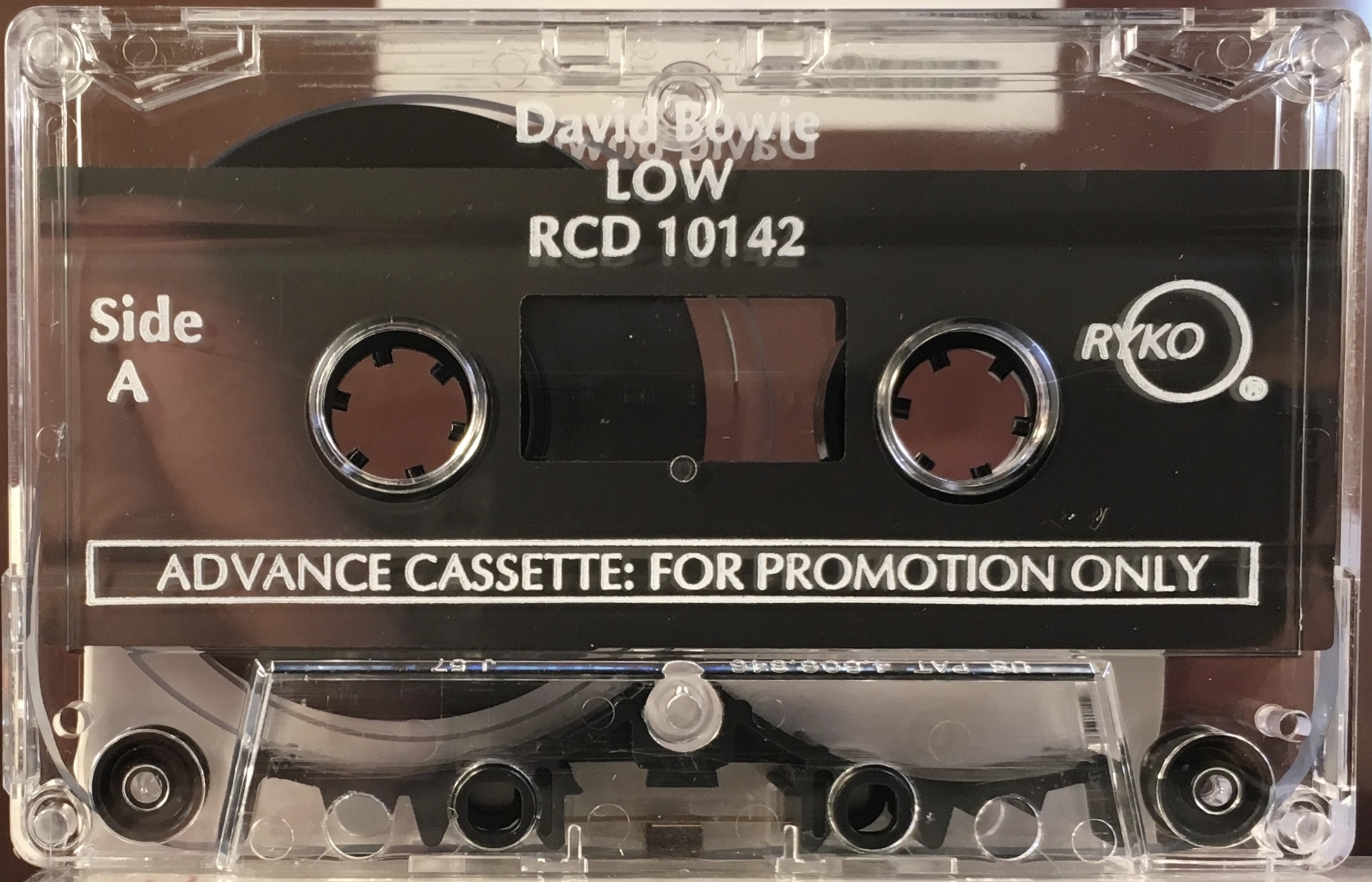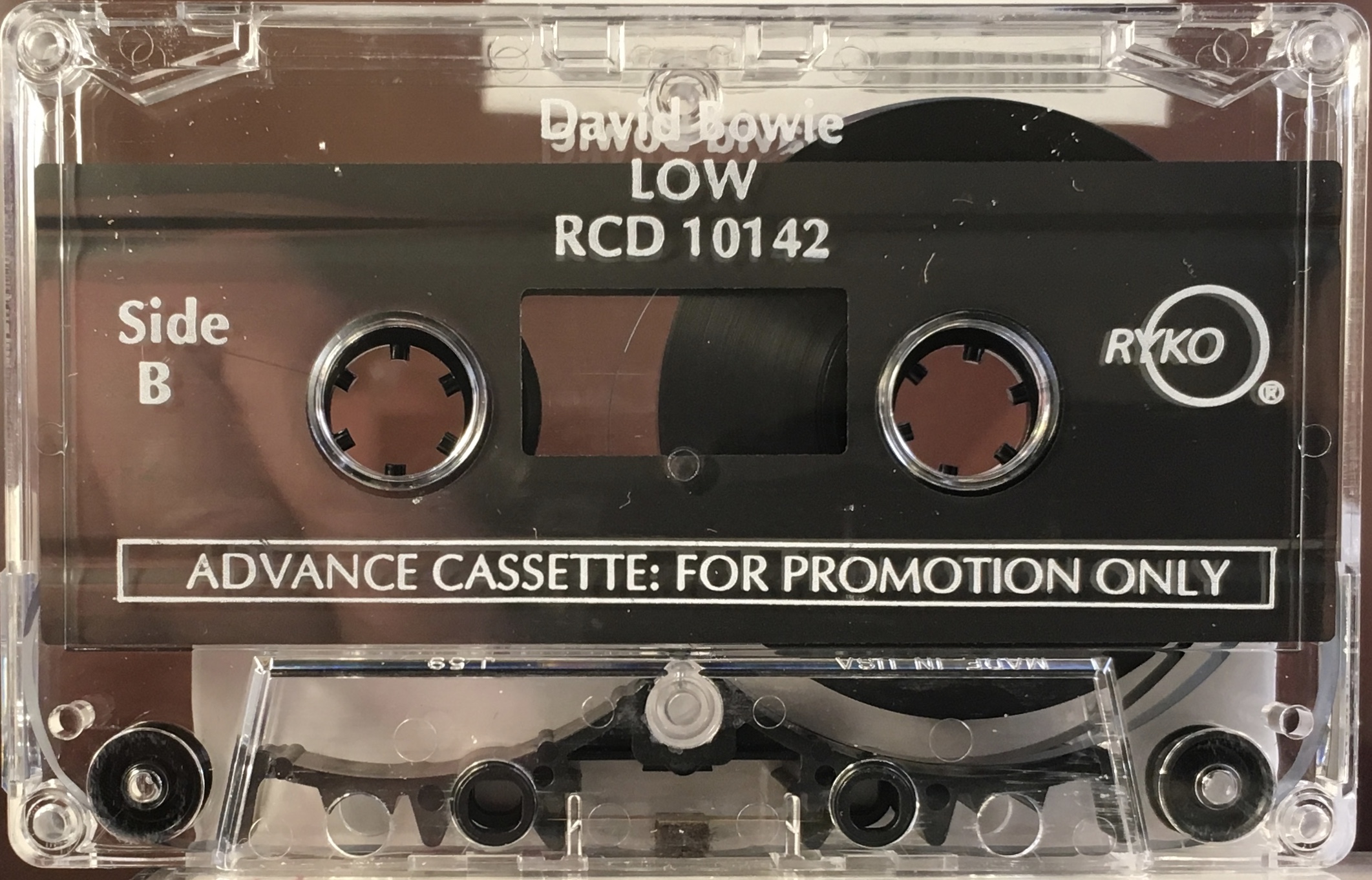 RYKO cassette on chrome tape boasting CDQ (Compact Disc Quality), blue ink printed directly onto clear shell. The cover (J-card) can be identified on the USA RYKO stock releases as the last panel which forms the rear of the box is shorter than the rest of the cover.