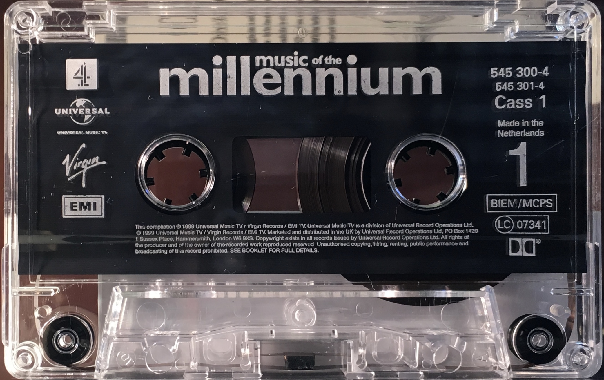 White ink printed directly to clear shell with plain sip sheet marked with BIEM/ MCPS rights.