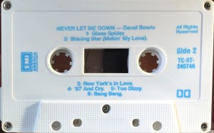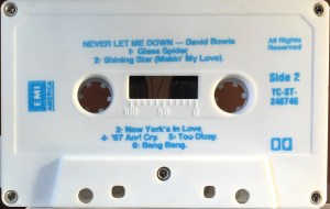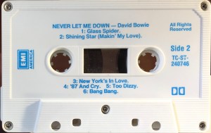 Side 2: Glass Spider; Shining Star (Makin’ My Love); New York’s In Love; ’87 And Cry; Too Dizzy; Bang Bang.