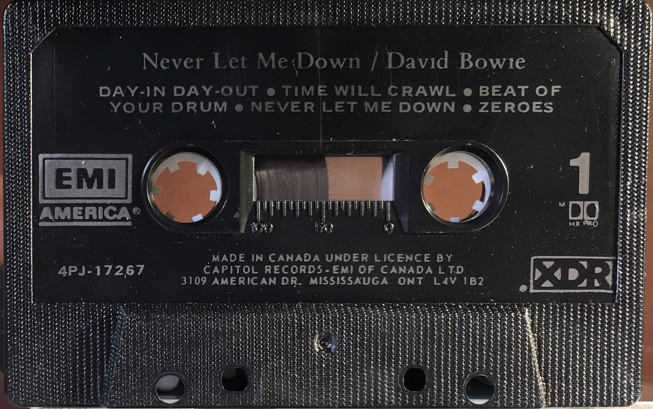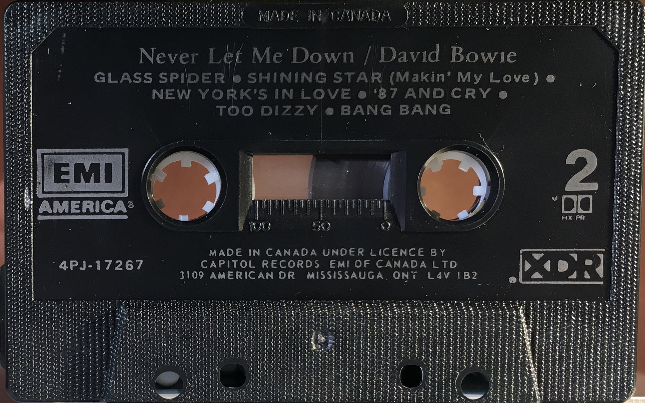 Black cassette, grey ink printed directly to shell. The shell states ‘Made in Canada under licence by Capitol Records- EMI of Canada’. XDR logo and track list printed on it.
