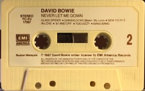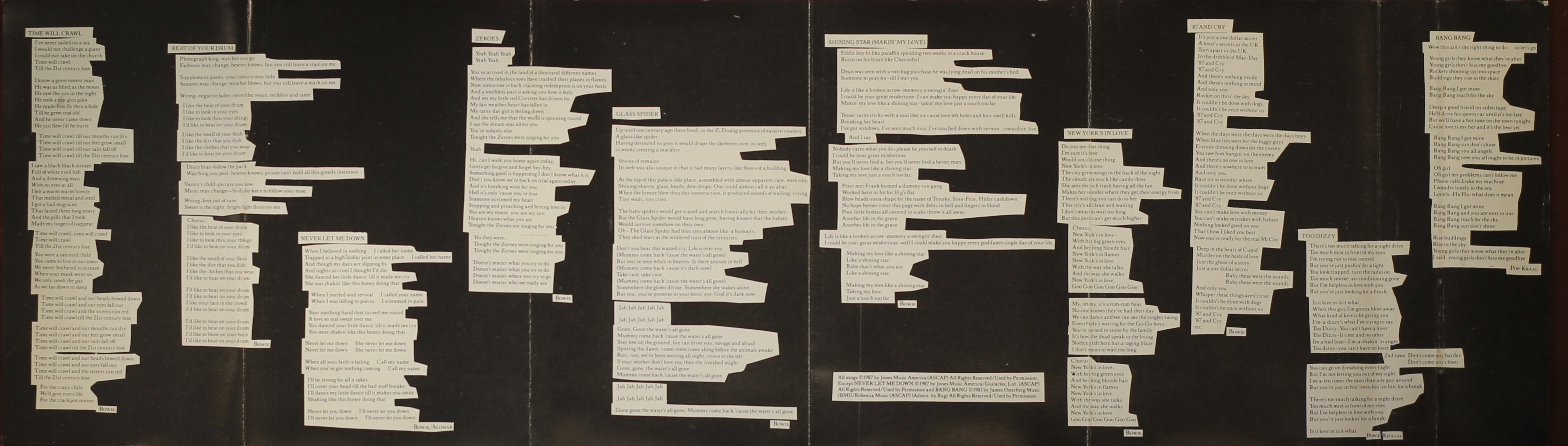 Side 2: Glass Spider; Shining Star (Makin’ My Love); New York’s In Love; ’87 And Cry; Too Dizzy; Bang Bang.