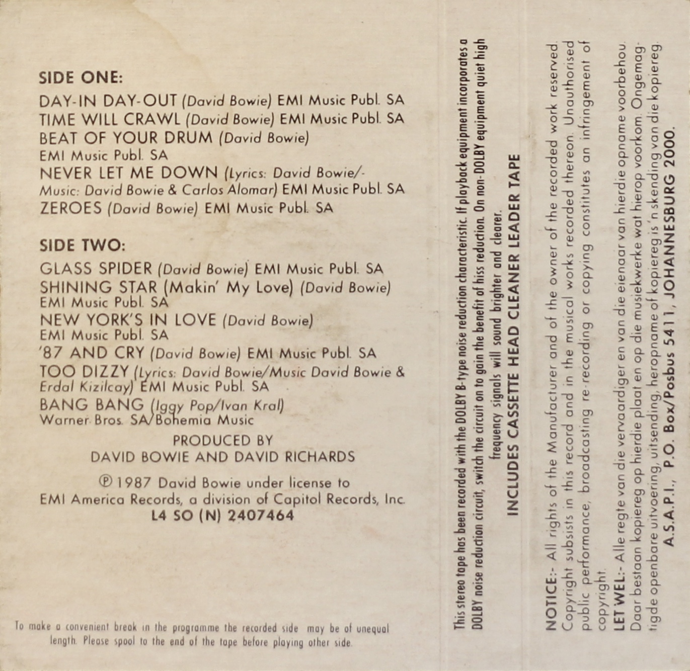 Side 2: Glass Spider; Shining Star (Makin’ My Love); New York’s In Love; ’87 And Cry; Too Dizzy; Bang Bang.