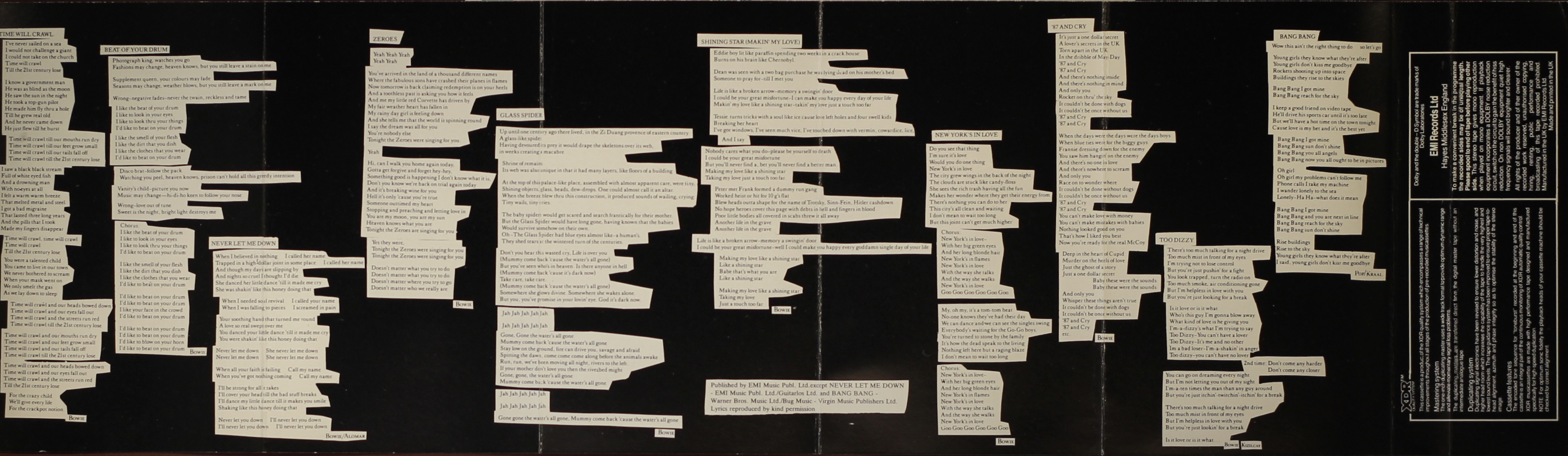 Side 2: Glass Spider; Shining Star (Makin’ My Love); New York’s In Love; ’87 And Cry; Too Dizzy; Bang Bang.