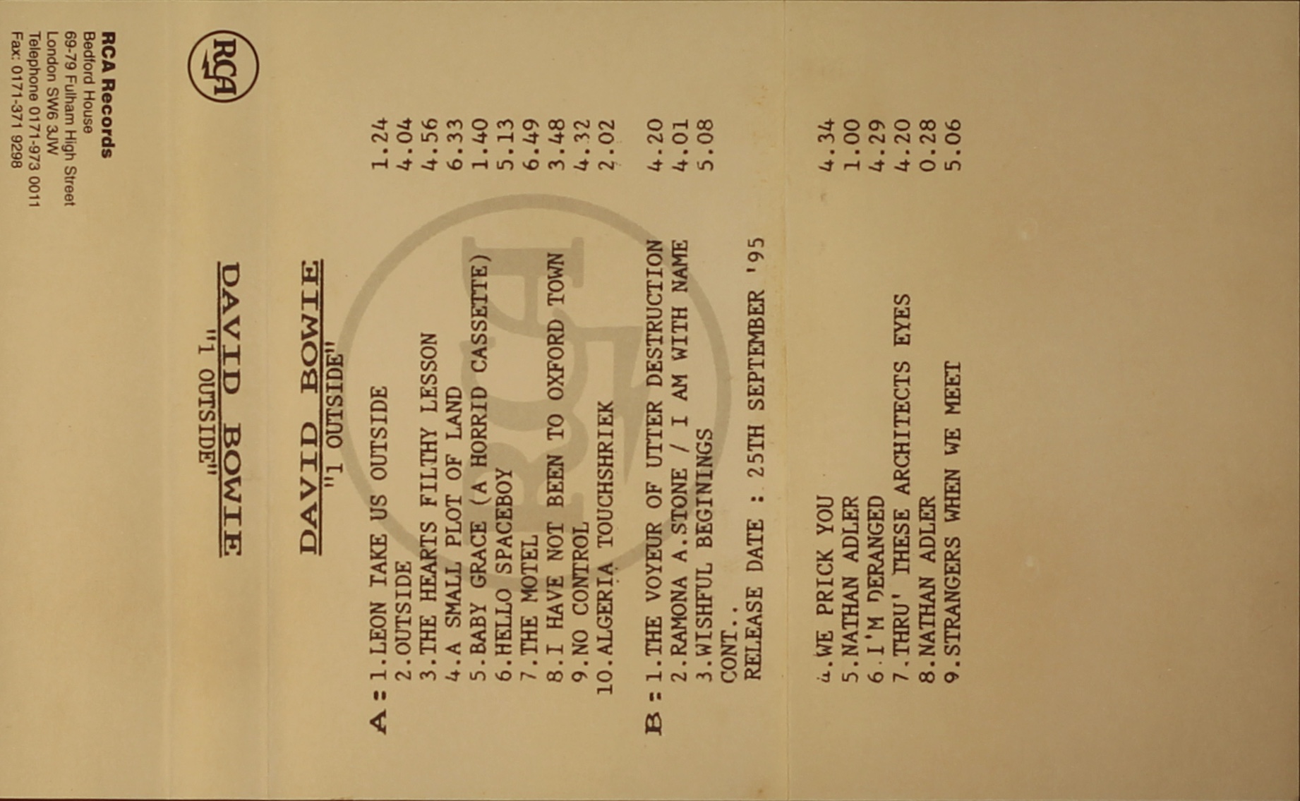 Side 1: Leon Takes Us Outside; Outside; The Heart’s Filthy Lesson; A Small Plot Of Land; Segue – Baby Grace (a horrid cassette); Hallo Spaceboy; The Motel; I Have Not Been To Oxford Town; No Control.