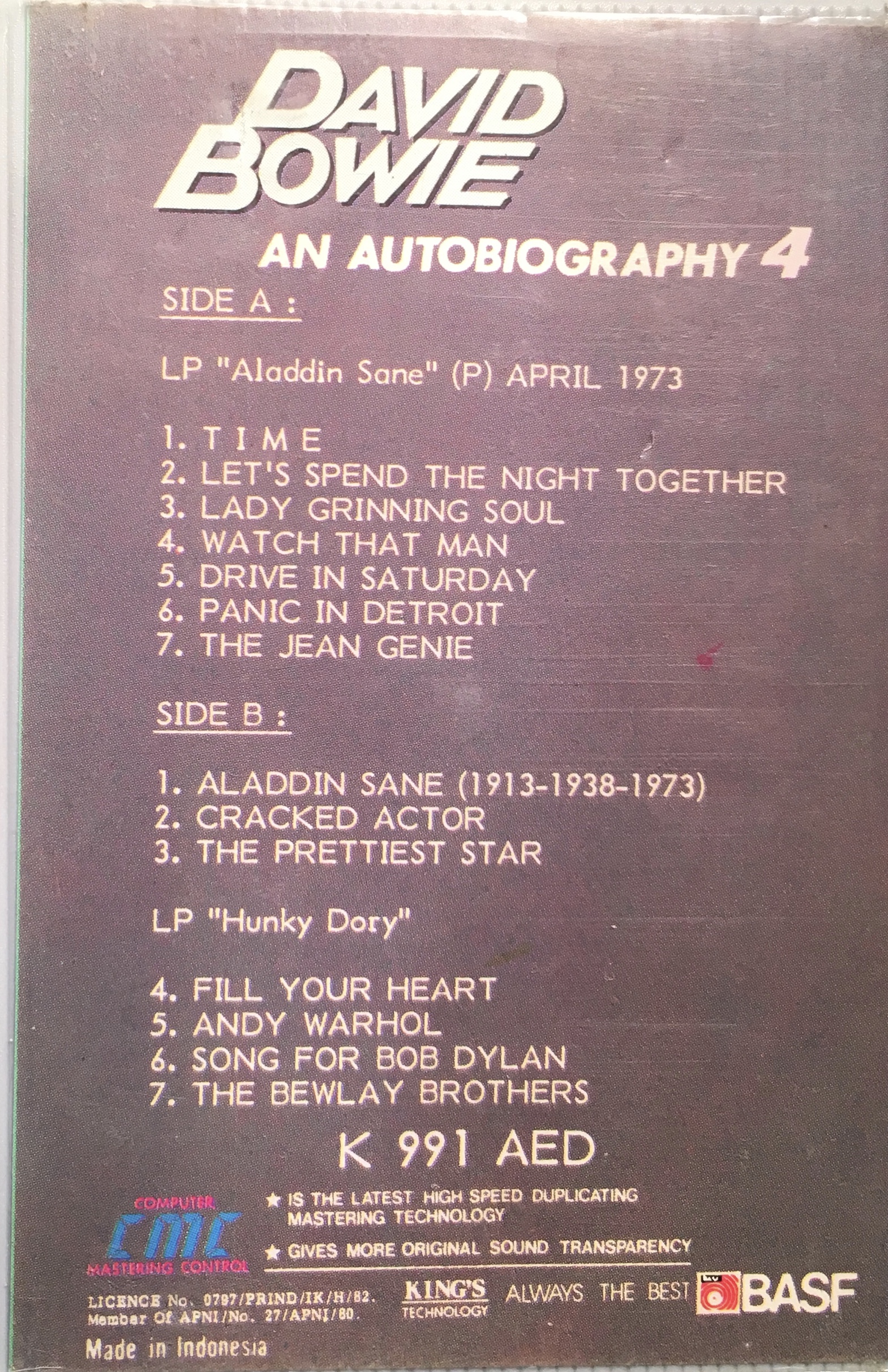 Easliy identifiable from their oversize ‘heatproof safety pack’ boxes and printed BASF tapes (BASF had a factory there), King’s ‘An Autobiography’ purports to be a chronological run through the David Bowie catalogue.