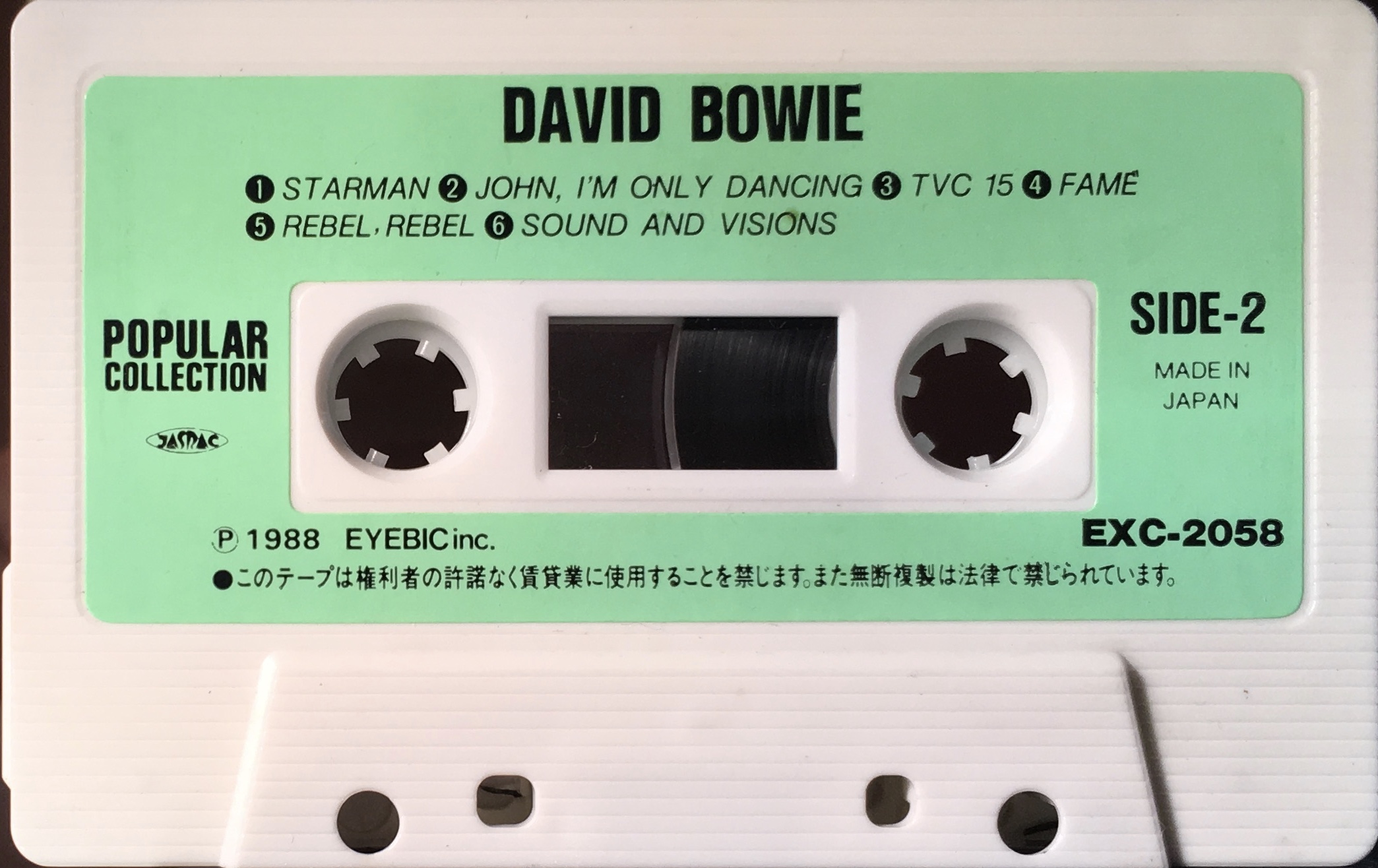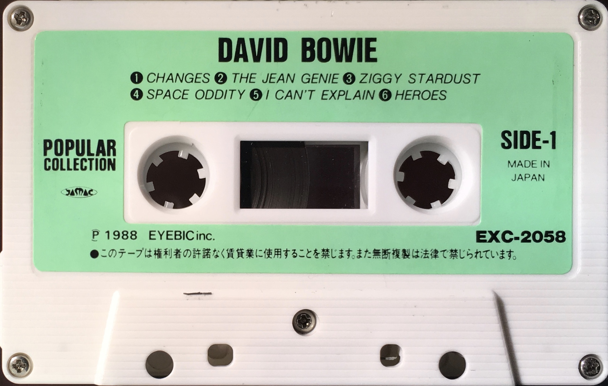 Green paper label on white shell; manufactured by Eyebic Inc. Comes with a lyric/ information page on light paper that folds into the tape box.