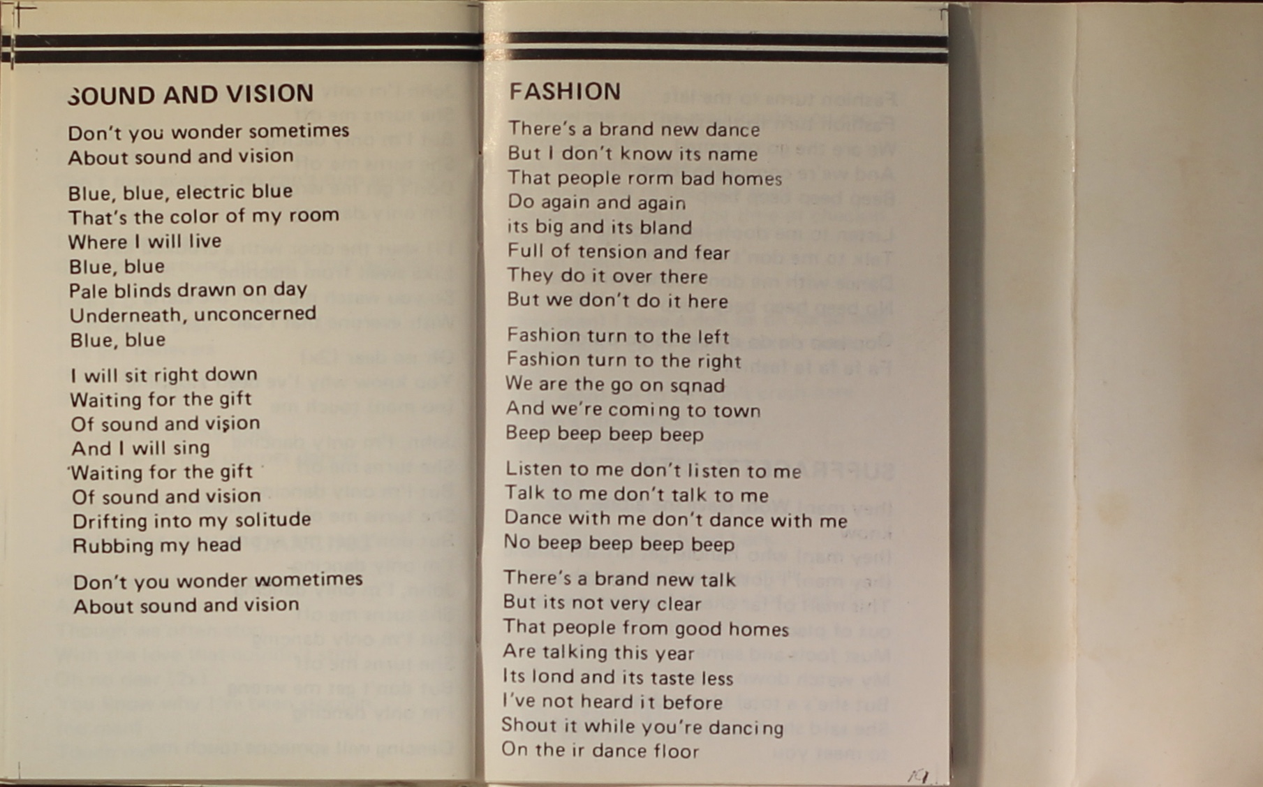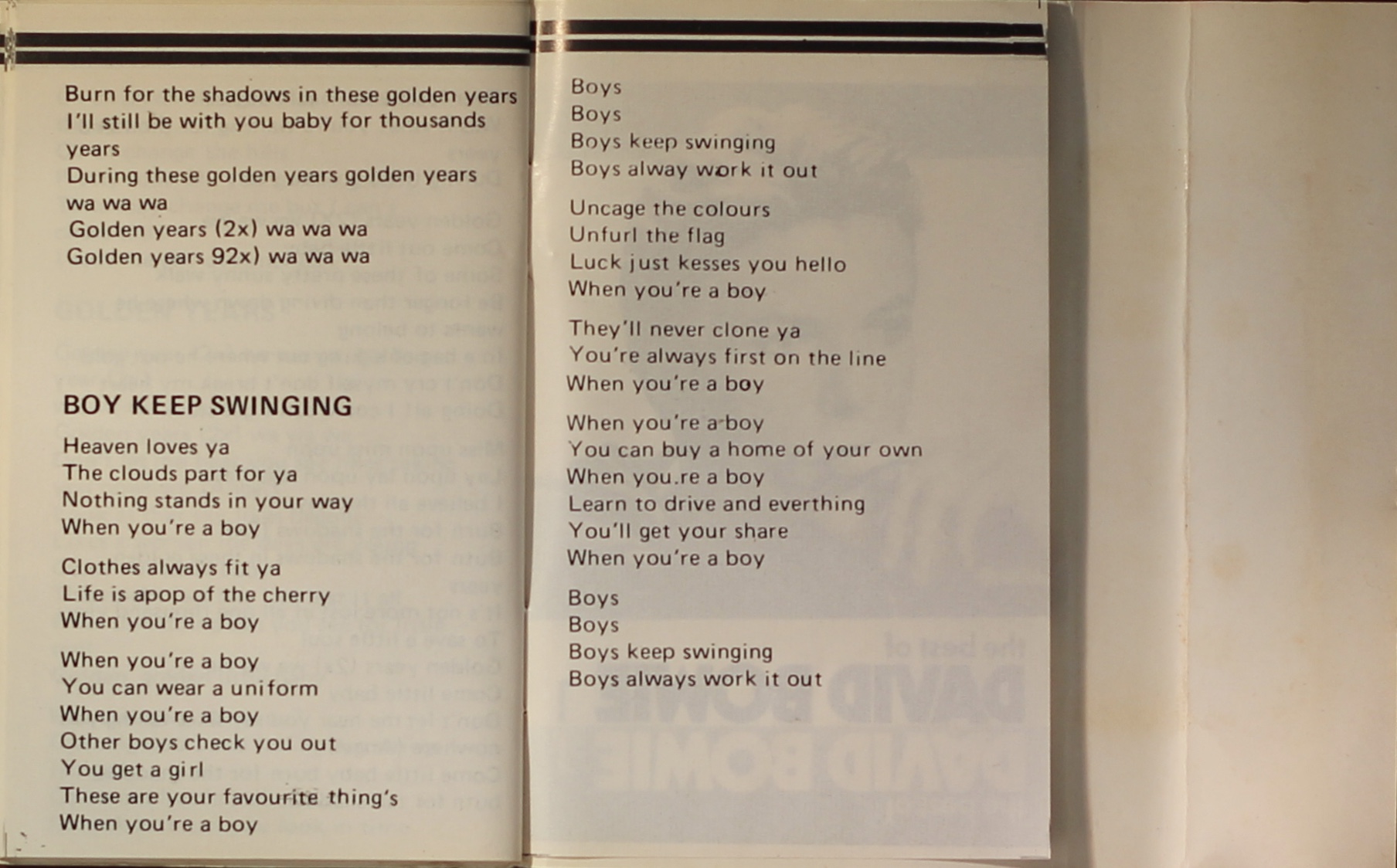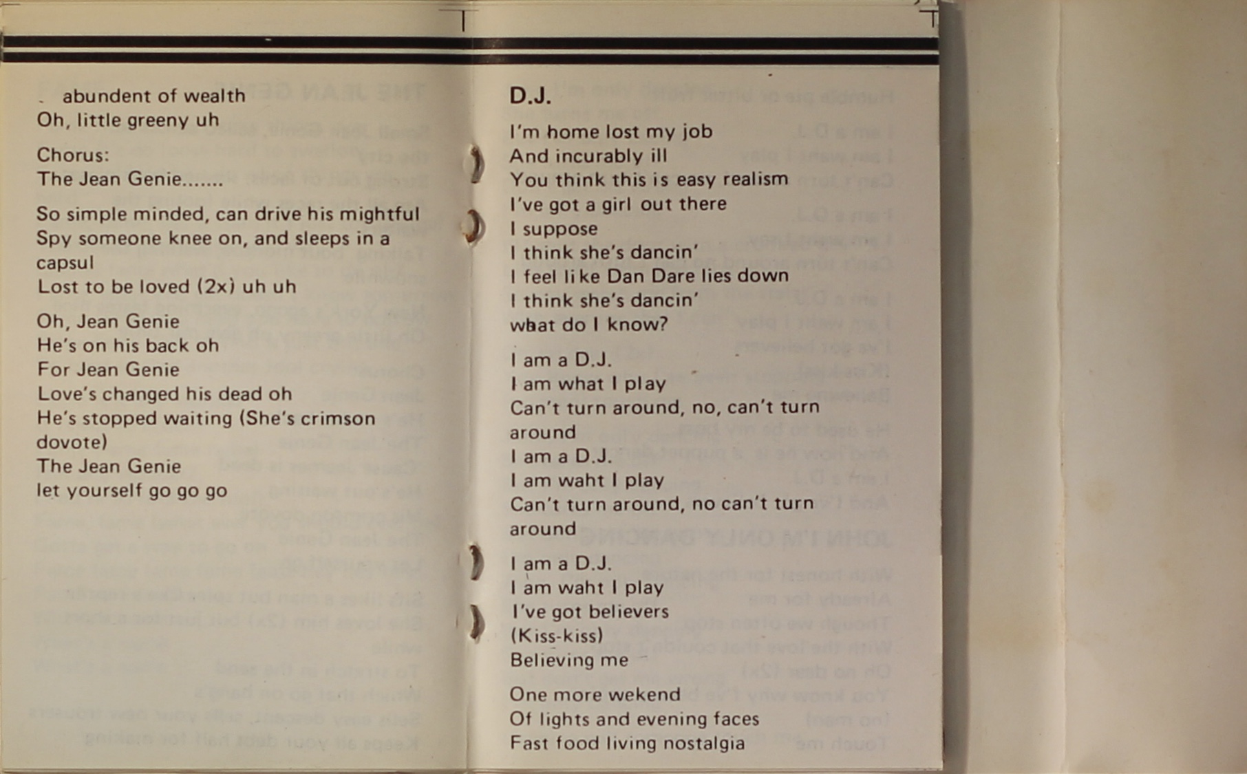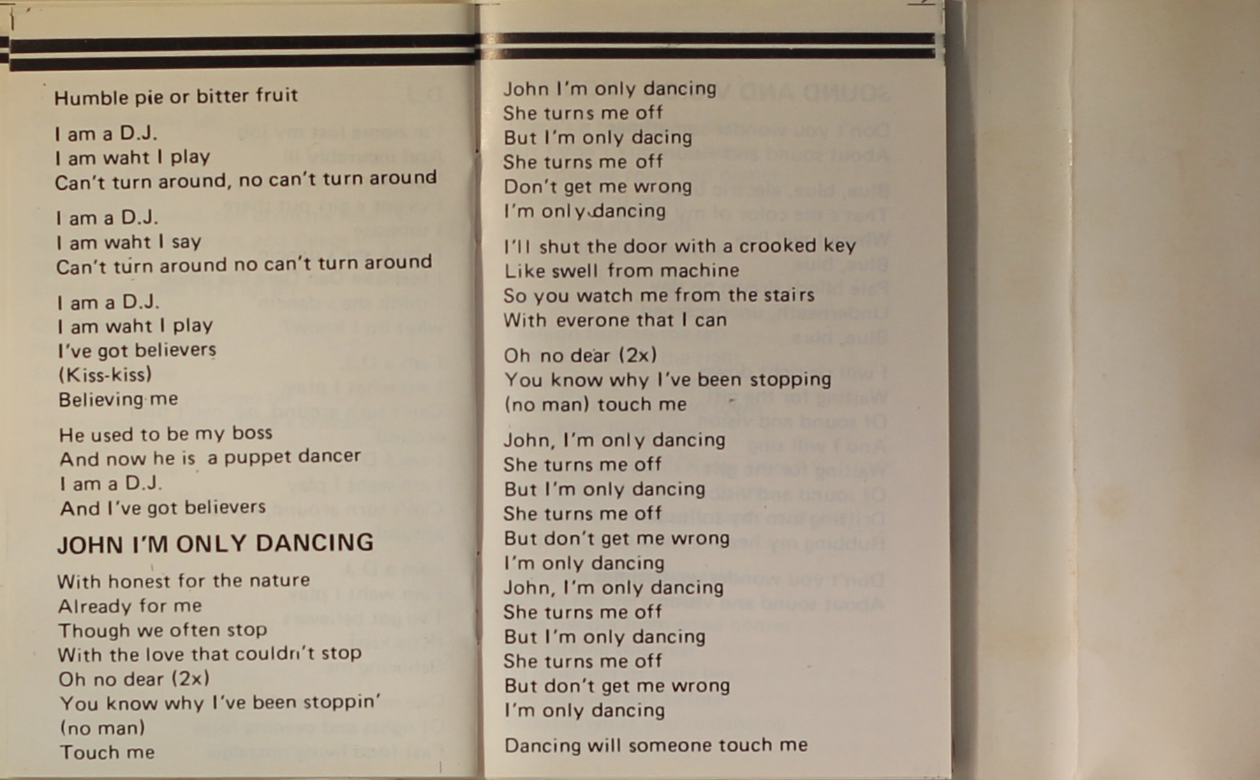 Side 2: D.J.; John I’m Only Dancing; Sound And Vision; Fashion; Suffragette City; Changes (listed as Chance); Golden Years; Boys Keep Swinging.