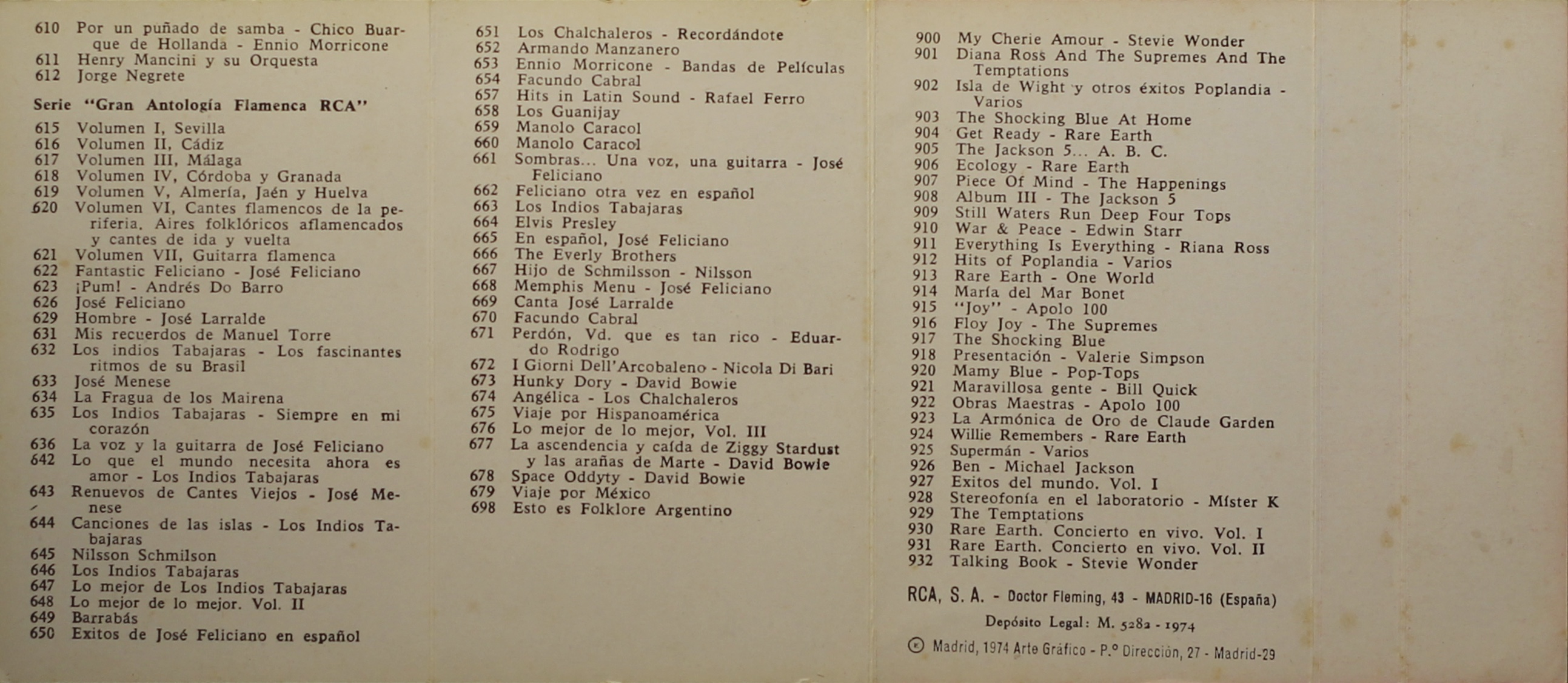 There is no information on the rear cover, track list is on the rear tab and inner. The inside cover gives the date of 1976. The cover is folded, glossy paper with perforated edges. The cover states Cara A & B for the sides but the cassette shows 1 & 2.