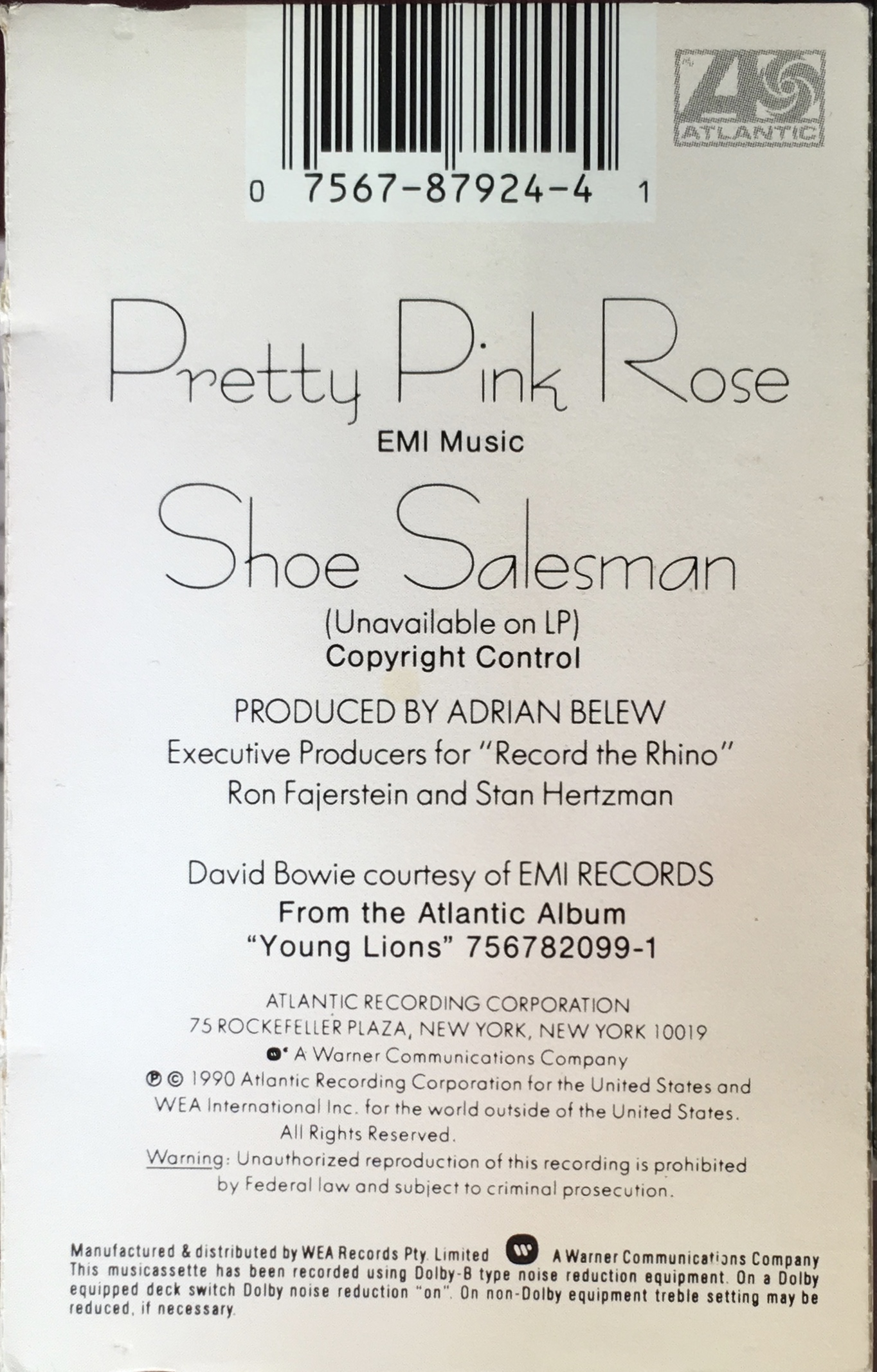 Cream coloured card slip-case with picture front rear panels. Track list on rear panel. ‘Manufactured by WEA Records Pty Ltd’. The rear cover has a barcode and there are ‘Atlantic’ and ‘CS’ logos on the spine. There are a number of differences to the USA cover: the price of $3.99 rrp is on the front cover; Pretty Pink Rose is credited to EMI Music; Shoe Salesman to Copyright Control; ‘Young Lions’ has a different catalogue number etc.