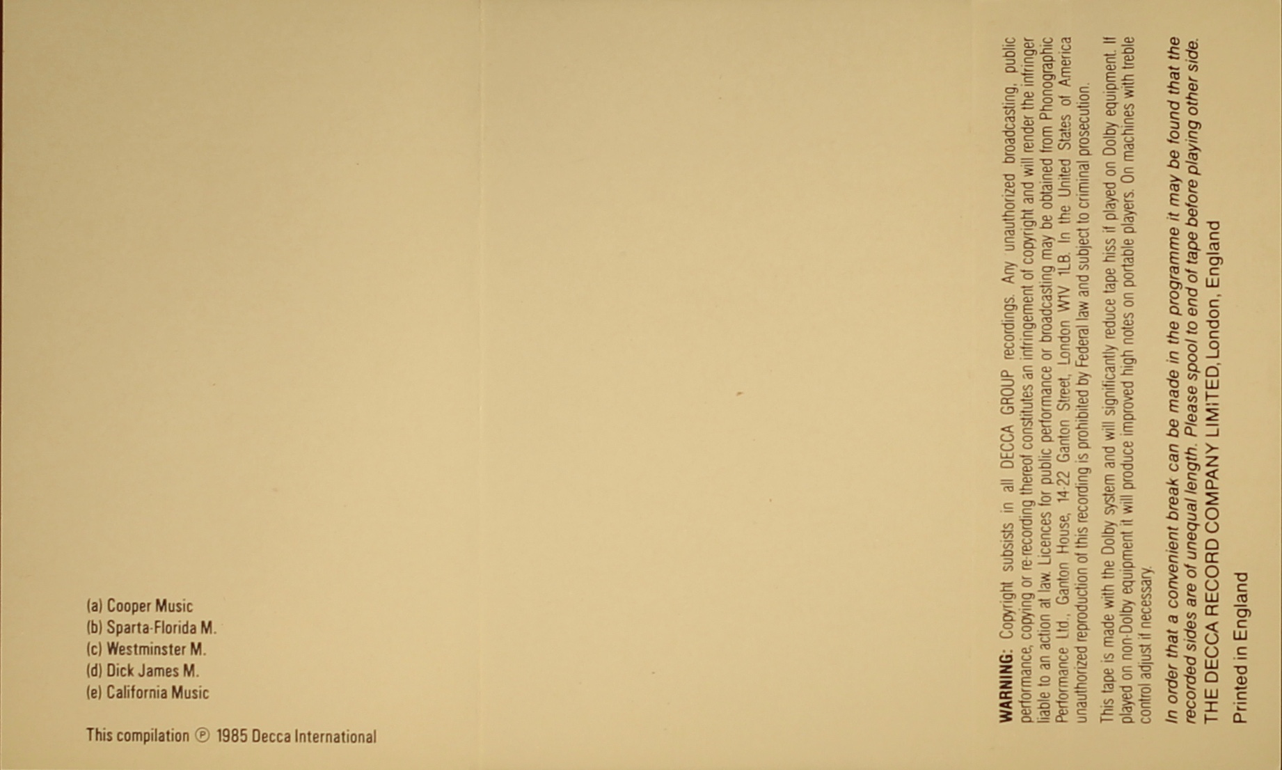 Full size cover photograph; white spine and rear and inner on stiff, glossy paper. Track list on rear and inner panels. Copyright information on inside panels. Barcode on rear panel. Comes in PolyGram stamped case.