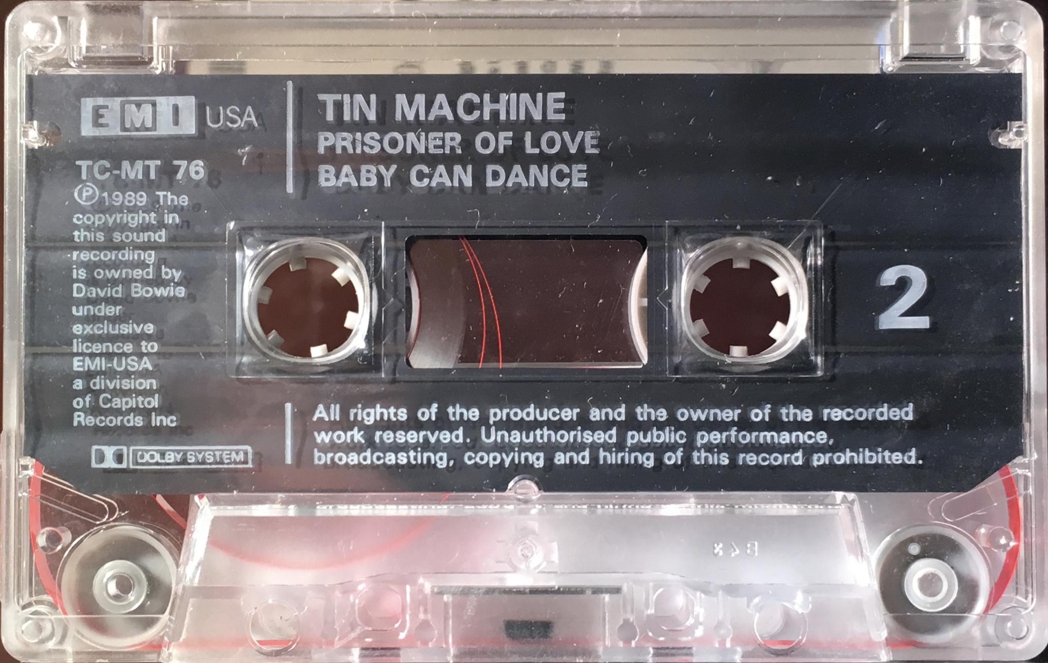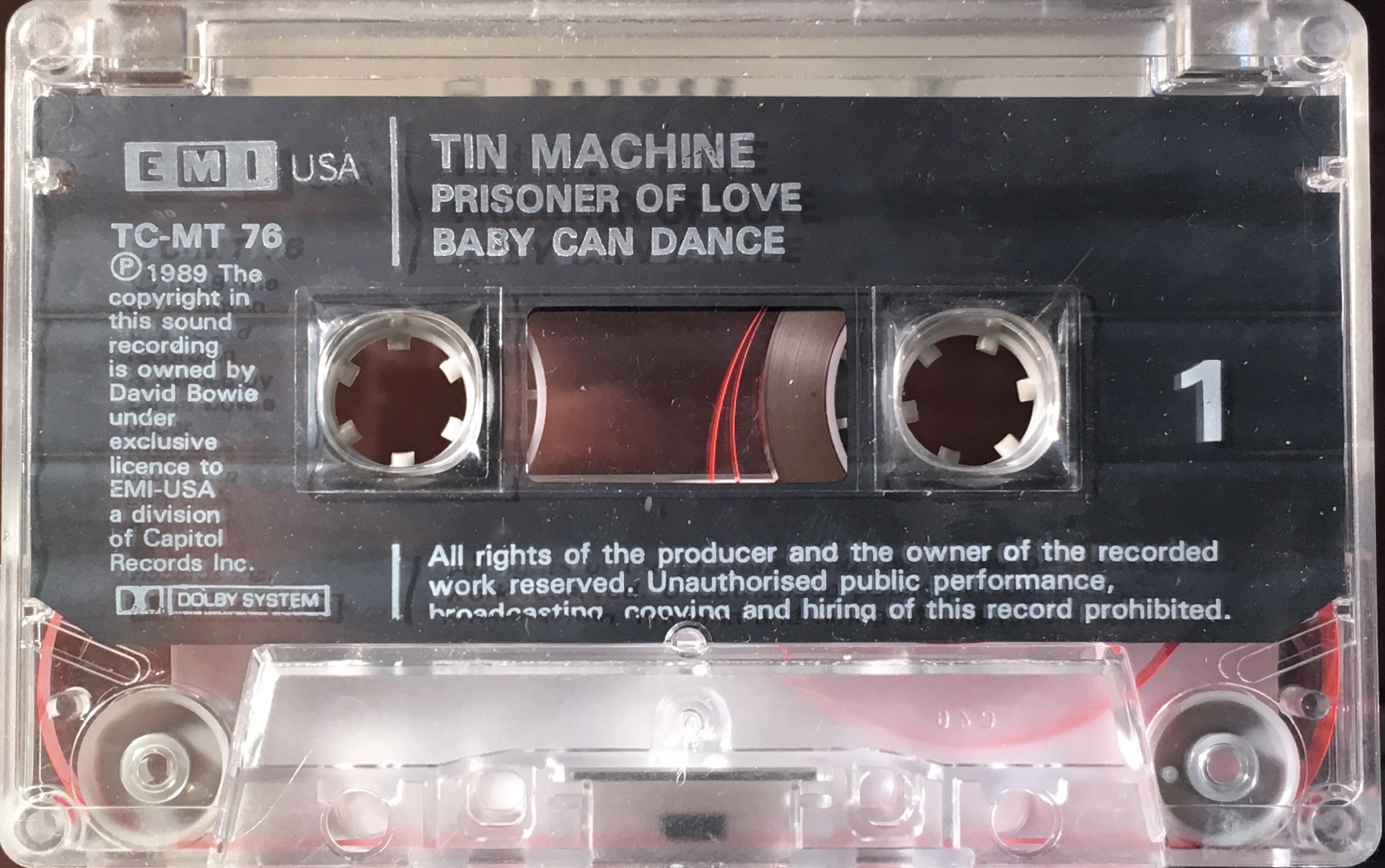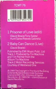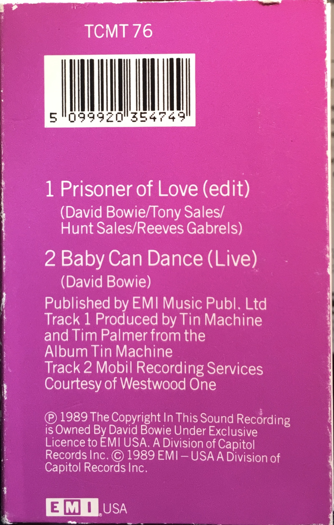 Card slip-case; picture front with pink rear panel and white sides. Track list on rear panel. The rear cover has a barcode and ‘EMI USA’ logo. The sides have ‘Tin Machine’ on one and ‘cassette single’ on the other.