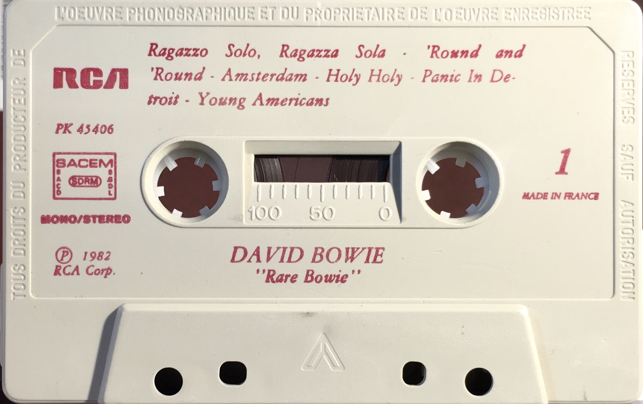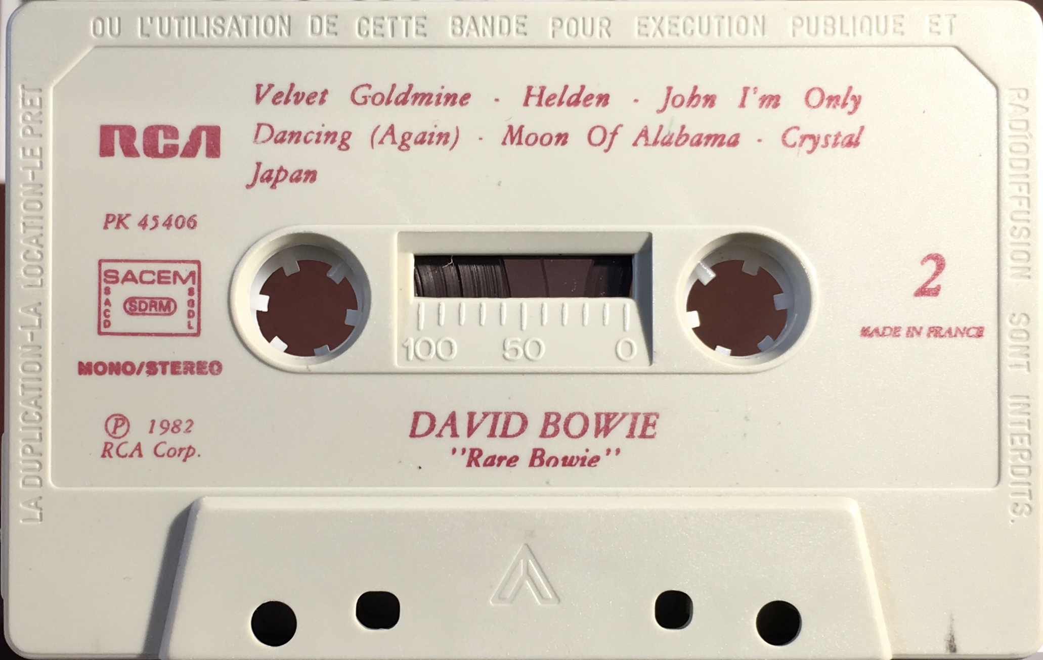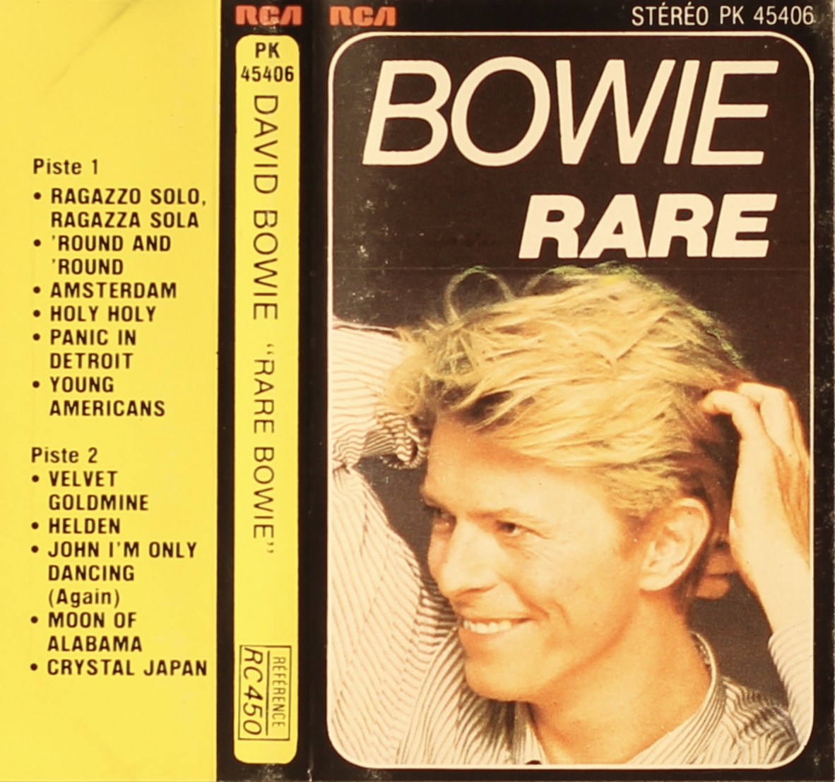 Full photo cover bordered in black; yellow spine and rear panel. The cover is thick, treated and folded paper and the rear has the track list and care information which is in French and SDRM logo on inner rear panel. The title is given on the cassette and spine as “Rare Bowie”.