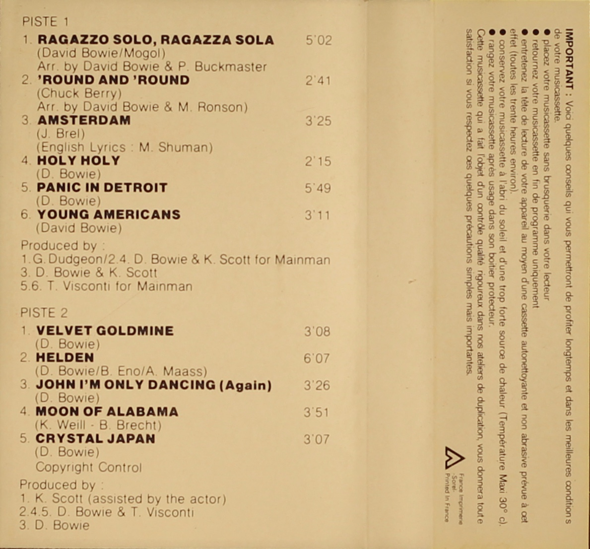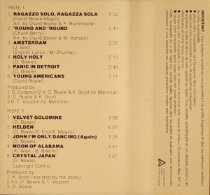 Side 1: Ragazzo Solo, Ragazza Sola; ‘Round And ‘Round; Amsterdam; Holy Holy; Panic In Detroit; Young Americans.