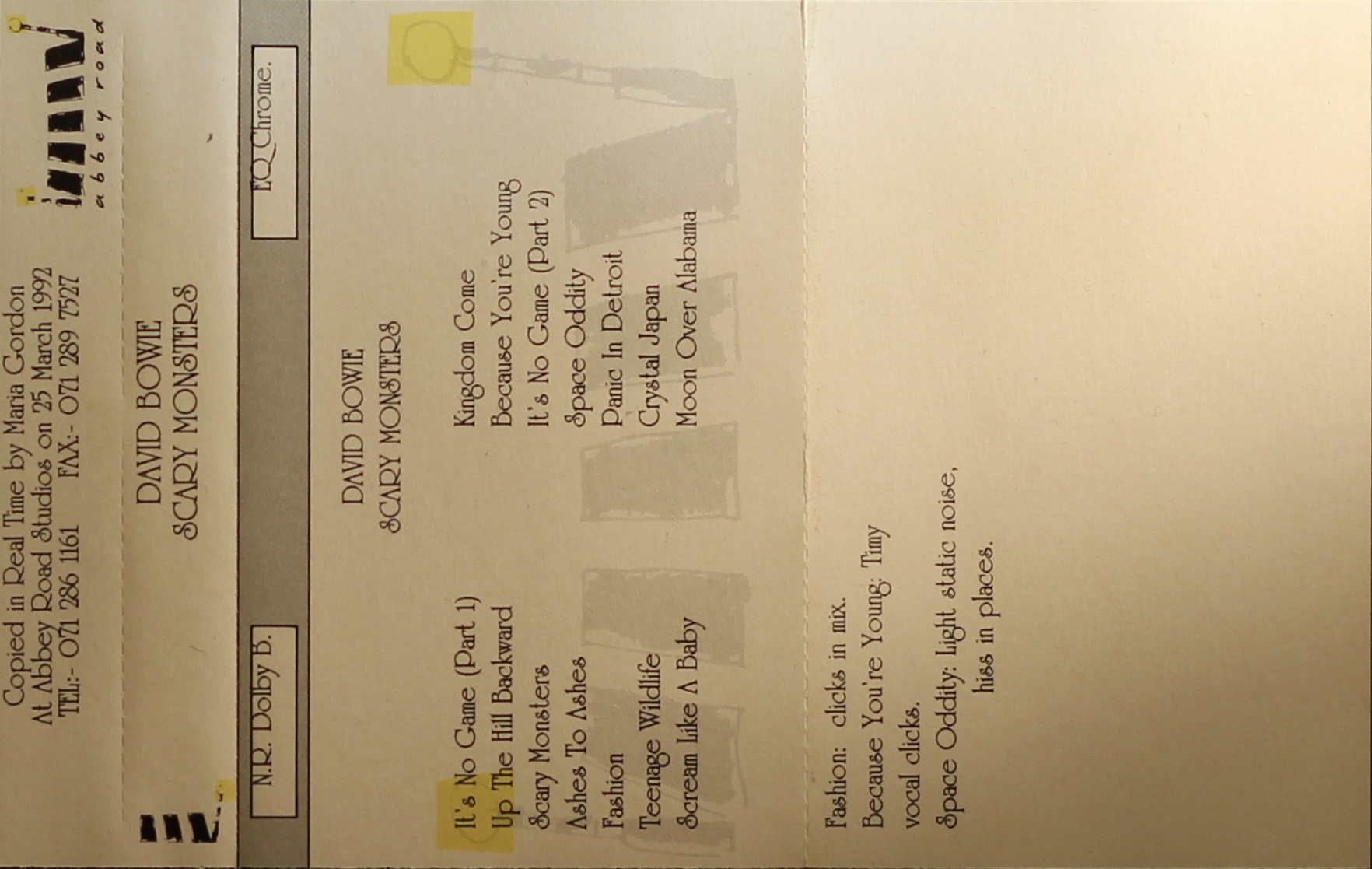 Lodger: EMI reference tape ; no catalogue number – Abbey Road Studios.