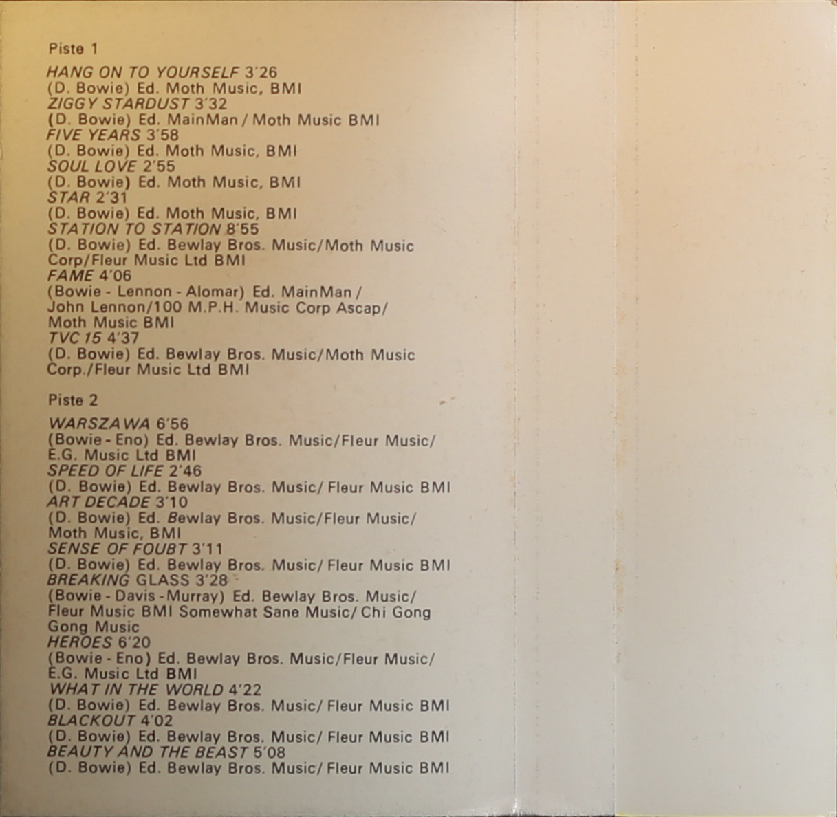 Side 2: Warszawa; Speed Of Life; Art Decade; Sense Of Doubt; Breaking Glass; “Heroes”; What In The World; Blackout; Beauty And The Beast.