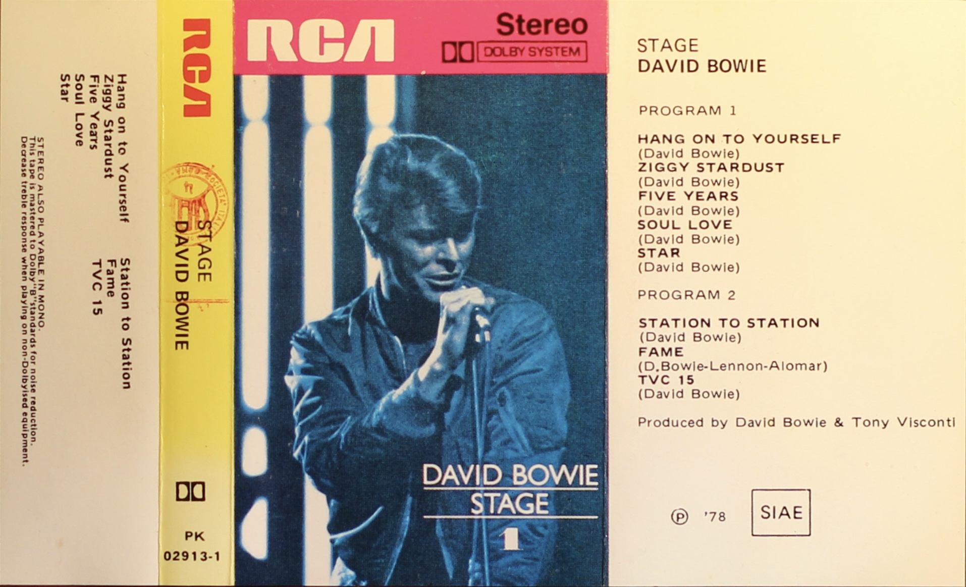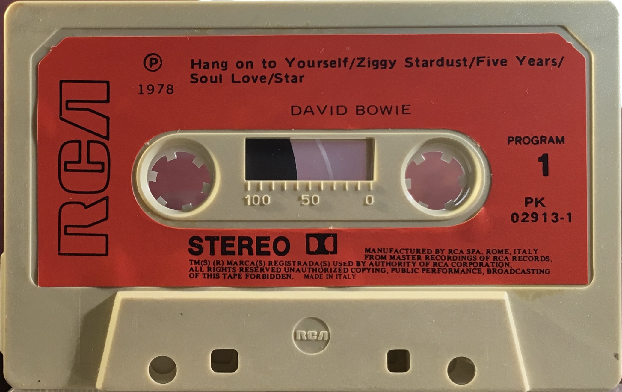 RCA red label with hollow black RCA logo on white RCA cassette. Label information: “Manufactured by RCA SPA Rome, Italy from master recordings of RCA Records” and “Made In Italy”.
