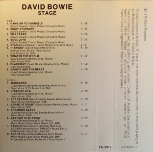 Side 1: Hang On To Yourself; Ziggy Stardust; Five Years; Soul Love; Star; “Heroes”; What In The World; Blackout; Beauty And The Beast.