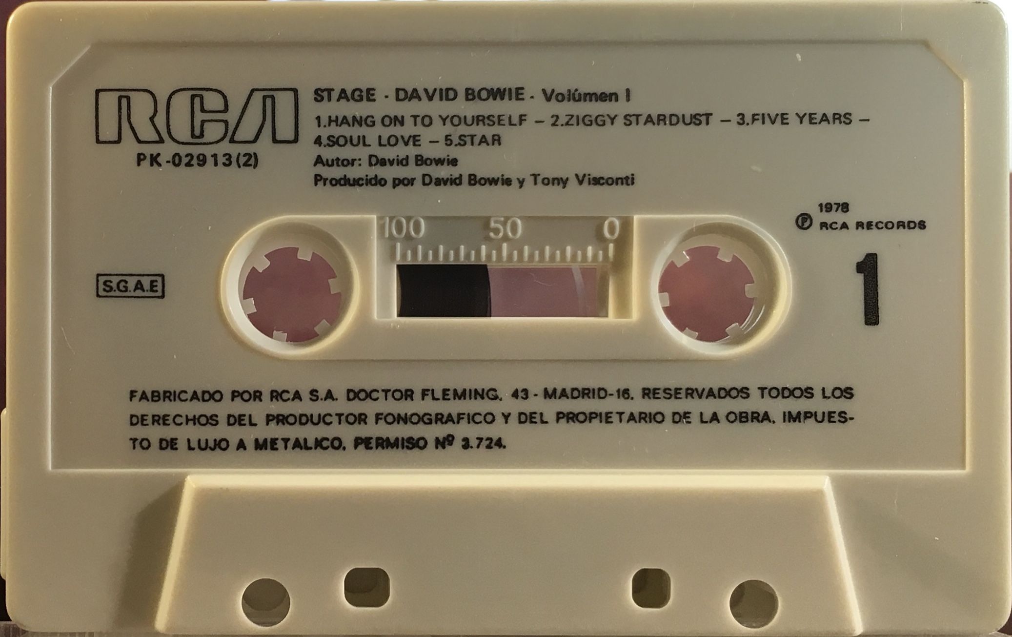 Black ink printed directly onto white or off-white shell with a horizontal hollow black RCA logo, SGAE rights and Spanish text on side 1 and English on side 2. (‘Fabricado por RCA S.A. Dr Fleming…’)
