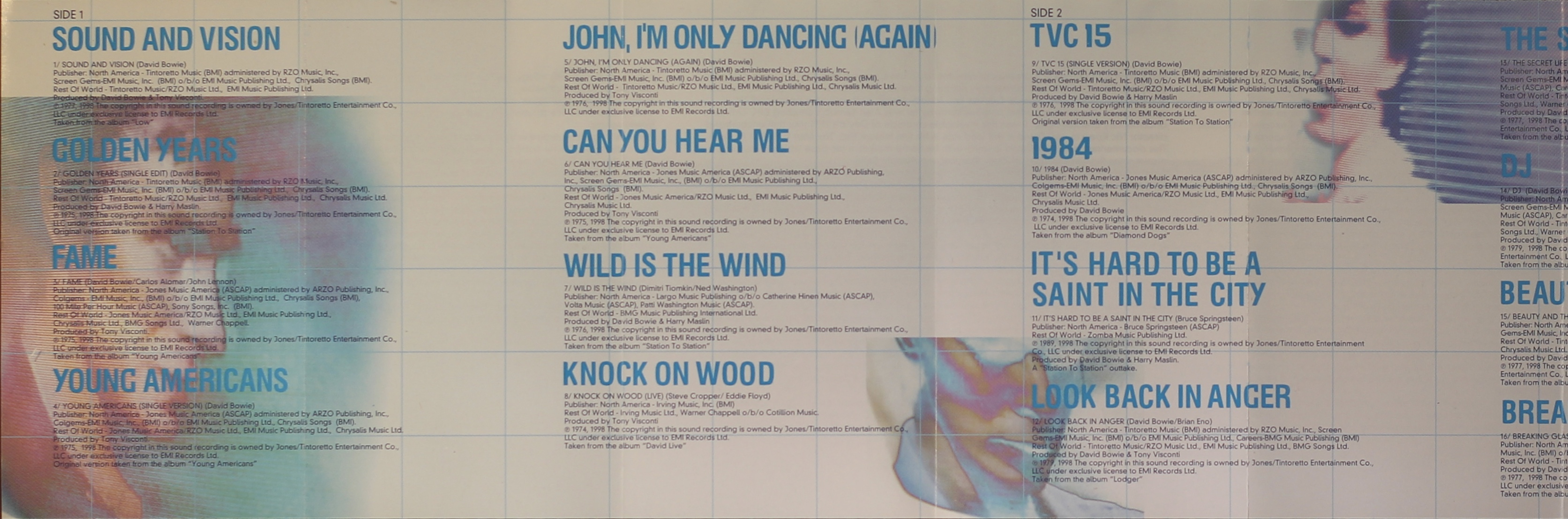 Side 1: Sound And Vision; Golden Years; Fame; Young Americans; John I’m Only Dancing (Again); Can You Hear Me; Wild Is The Wind; Knock On Wood.