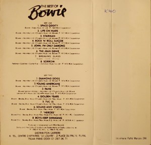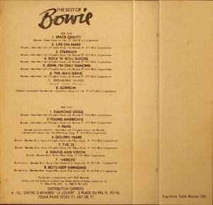 Side 1: Space Oddity; Life On Mars; Starman; Rock ‘N’ Roll Suicide; John I’m Only Dancing; The Jean Genie; Breaking Glass; Sorrow.