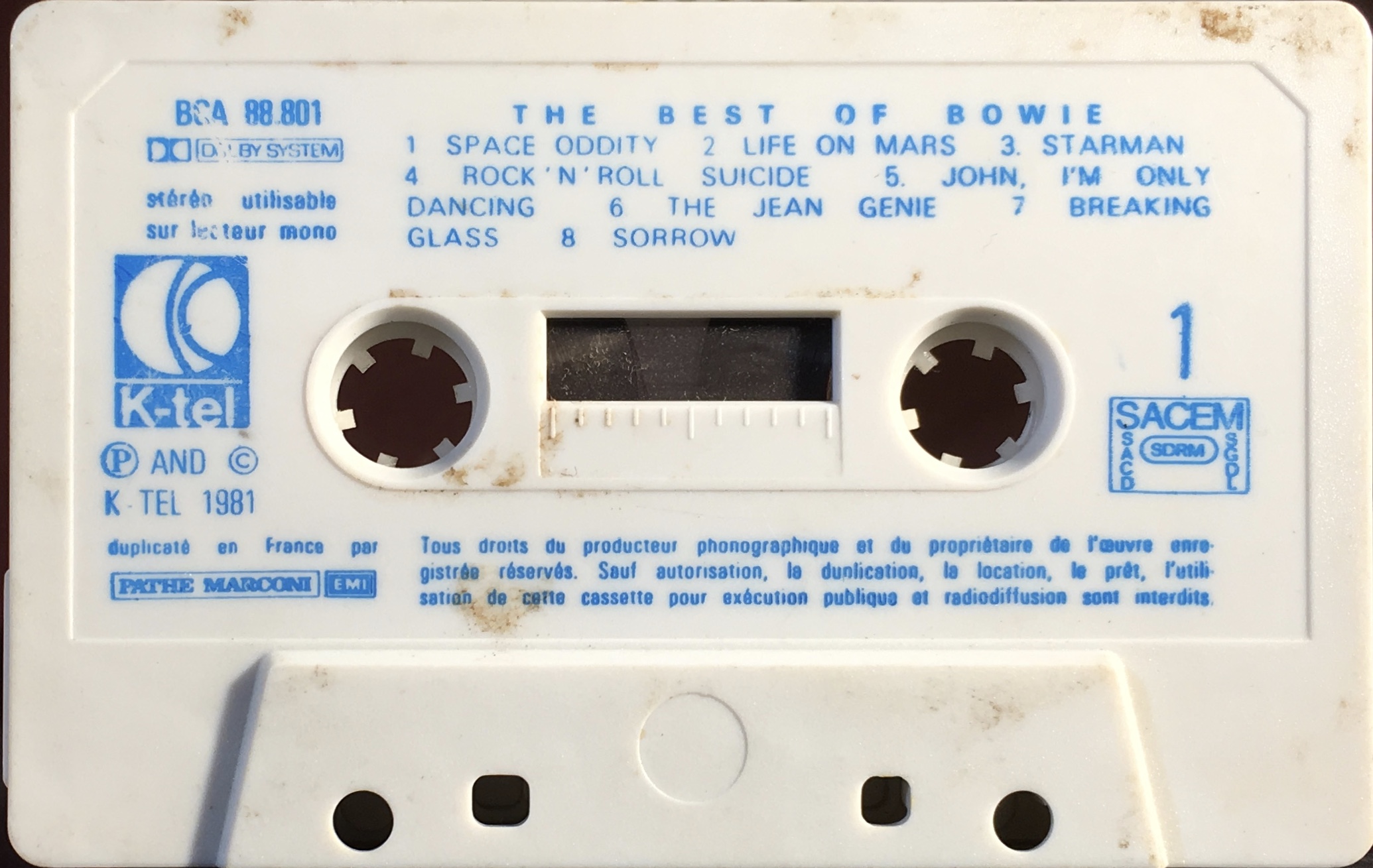 Blue ink printed directly onto white shell with ‘K-tel; duplicaté en France par Pathe Marconi and EMI’. SACEM rights.