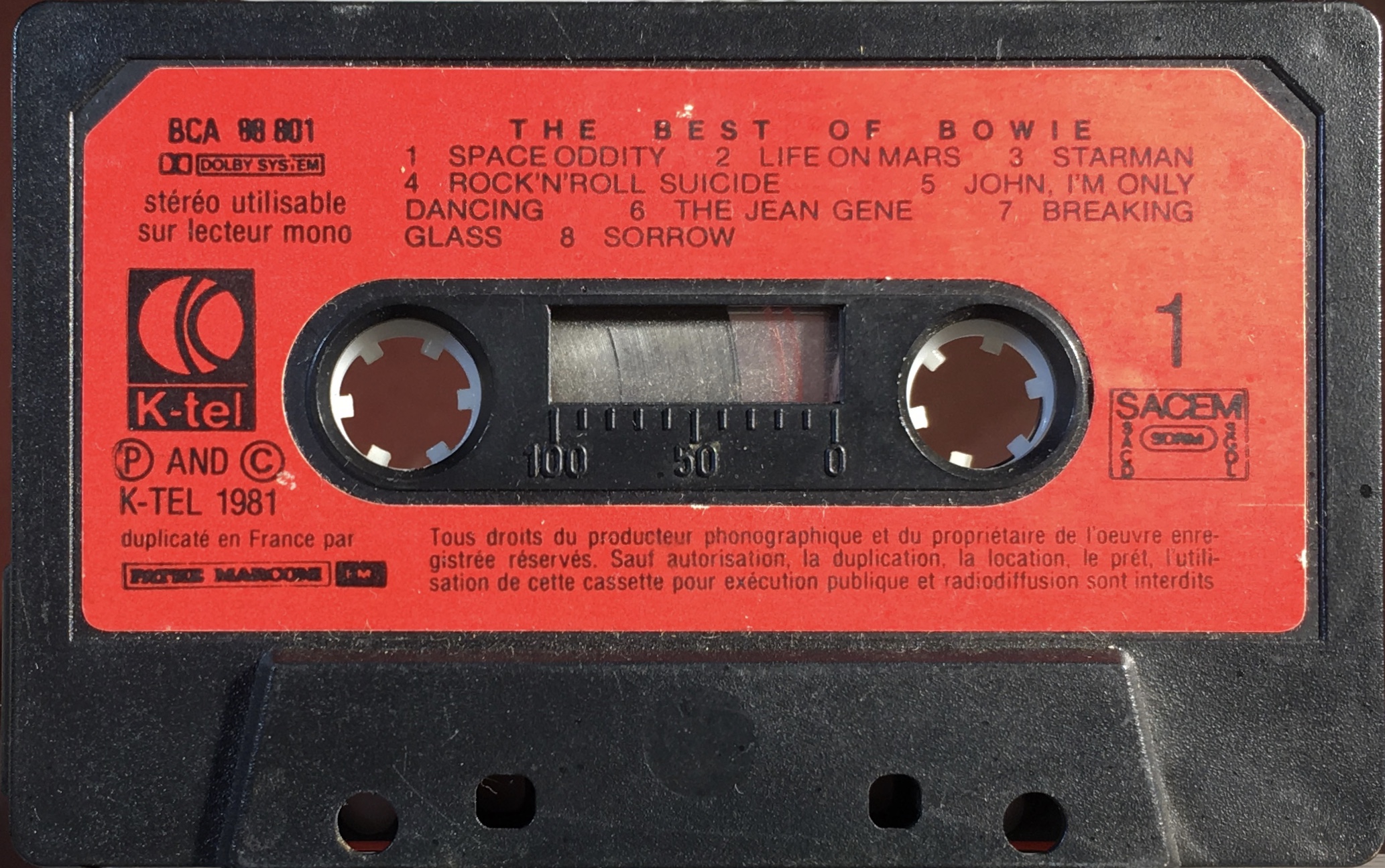 Black ink on red label onto black shell with ‘K-tel; duplicaté en France par Pathe Marconi and EMI’. SACEM rights.
